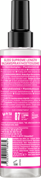 Pettynyt pitkiin, elottomiin ja vaurioituneisiin hiuksiin, jotka sinun on leikattava kuukausittain? Gliss Supreme Length hoitosuihke on hiuksiin jätettävä hoitoaine, joka ravitsee ja kosteuttaa pörröisiä ja sähköisiä hiuksiasi taaten täydellisen kammattavuuden käytön jälkeen. Sisältää biotiinia ja pionin kukkaa, jotka korjaavat vaurioituneita hiuksiasi ja lisäävät pitkiin hiuksiisi eloisuutta. Hoitosuihkeen lämpösuoja suojaa lämpökäsittelyn aiheuttamia vahinkoja vastaan. Supreme Length tuotelinjan tuotteet ovat Gliss hoitoasteikon ensimmäisen tason tuotteita, ja ne sopivat erityisesti normaaleille, mutta hennoille ja hieman kuiville hiuksille. Schwarzkopf GLISS takaa 100 % vahvemmat hiukset.* 87 % luonnollista alkuperää olevia aineosia** Tuote on PETA-sertifioitu. Schwarzkopf GLISS pakkaukset jopa 100 % kierrätettyä muovia. * vs. käsittelemättömät hiukset **Sisältäen veden