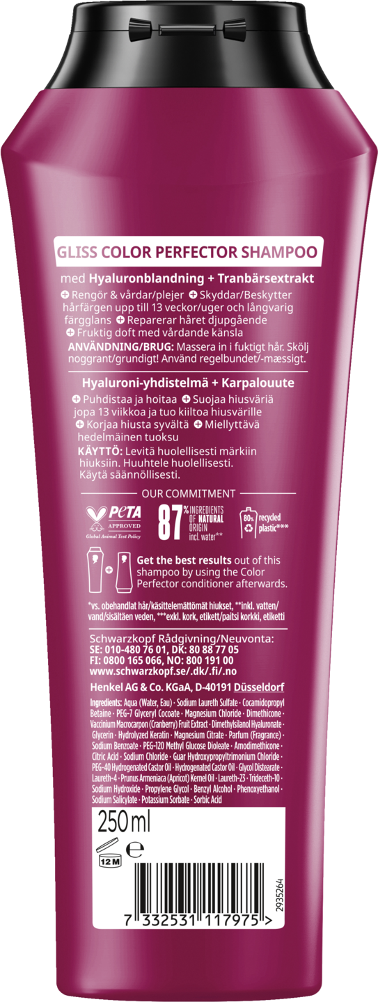Värjätyt tai raidoitetut hiukset tarvitsevat hoitoa ja erityistä suojaa säilyttääksensä intensiivisen värin ja kirkkautensa. Schwarzkopf Gliss Colour Perfector tuotesarja on suunnattu erityisesti korkeimman hoitotason hoitoa tarvitseville värjätyille hiuksille. Gliss Colour Perfector shampoo sisältää hyalironi-yhdistelmää, joka hoitaa hiuksiasi sisäisesti. Karpalouute auttaa säilyttämään hiusvärisi eloisana jopa 13 viikkoa. Schwarzkopf GLISS takaa 100 % vahvemmat hiukset.* PETA-sertifioitu ja jopa 87 % ainesosista luonnollista alkuperää.** Schwarzkopf GLISS pakkaukset jopa 100 % kierrätettyä muovia. * vs. käsittelemättömät hiukset **Sisältäen veden