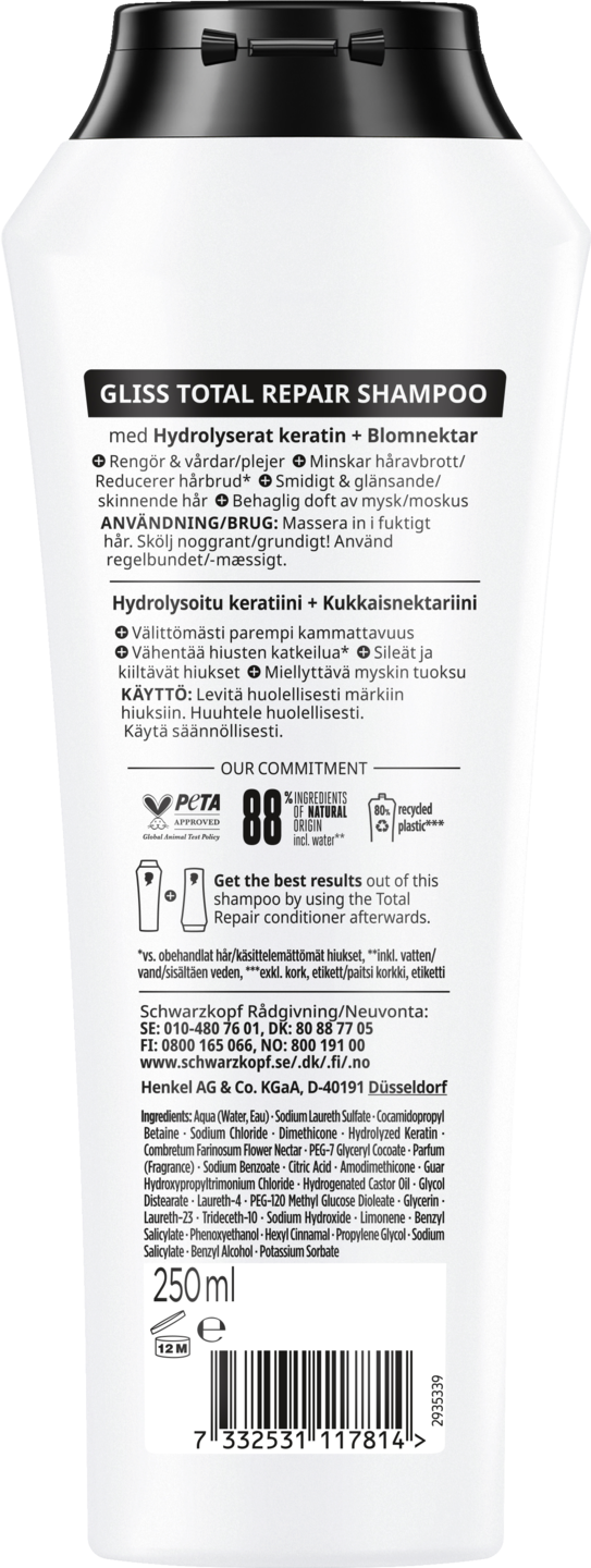 Hiukset altistuvat jatkuvasti erilaisille rasituksille, jotka aiheuttavat hiusten kuivumista ja katkeilua. Rasitusta vastaan hiukset kaipaavat korjaavaa hoitoa, joka siloittaa hiuksen pintaa. GLISS TOTAL REPAIR -shampoo hoitaa vahingoittuneita ja rasittuneita hiuksia. Hydrolisoidulla keratiinilla ja kukkaisnektariinilla rikastettu koostumus suojaa hiuskuituja ja kaunistaa hiuksen pintaa. Total Repair -tuotesarja sopii erityisesti korkeimman hoitotason hoitoa kaipaaville hiuksille. Schwarzkopf GLISS takaa 100 % vahvemmat hiukset.* PETA-sertifioitu ja jopa 88 % ainesosista luonnollista alkuperää.** Schwarzkopf GLISS pakkaukset jopa 100 % kierrätettyä muovia. * vs. käsittelemättömät hiukset **Sisältäen veden