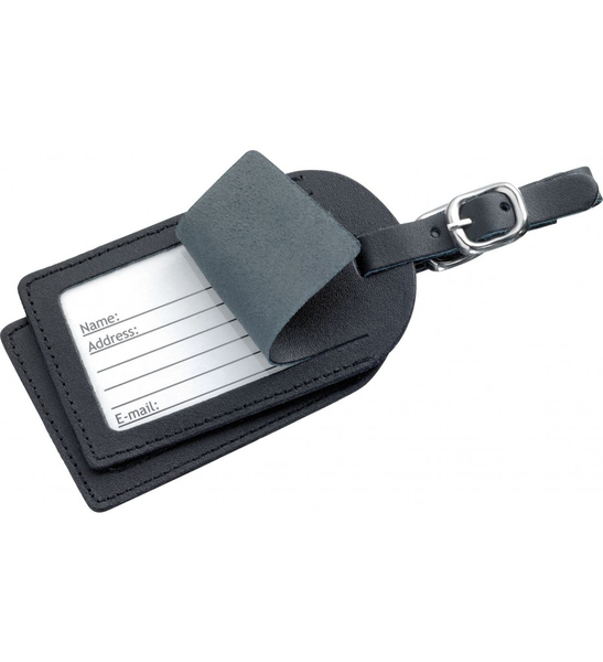 Kahden nahkaisen nimilapun pakkaus. Nimilappuun voit kirjoittaa nimen, osoitteen, puhelinnumeron ja sähköpostiosoitteen, ja sen avulla tunnistat matkalaukkusi.