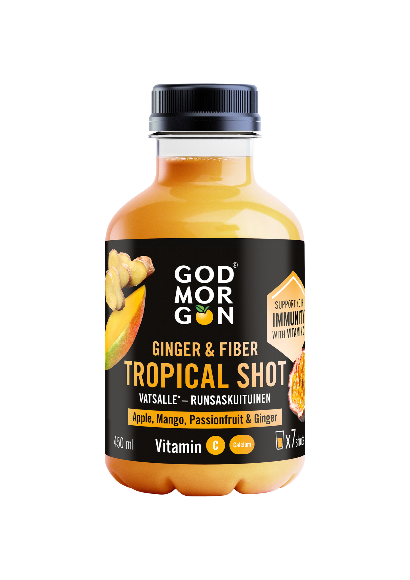 God Morgon Ginger Fiber Tropical Shot on runsaskuituinen, kalsiumia ja C-vitamiinia sisältävä shot vatsalle. Tuote on makeuttamaton. Sisältää appelsiinia, inkivääriä, mangoa ja passionhedelmää. Pakkauksessa 7 annosta.