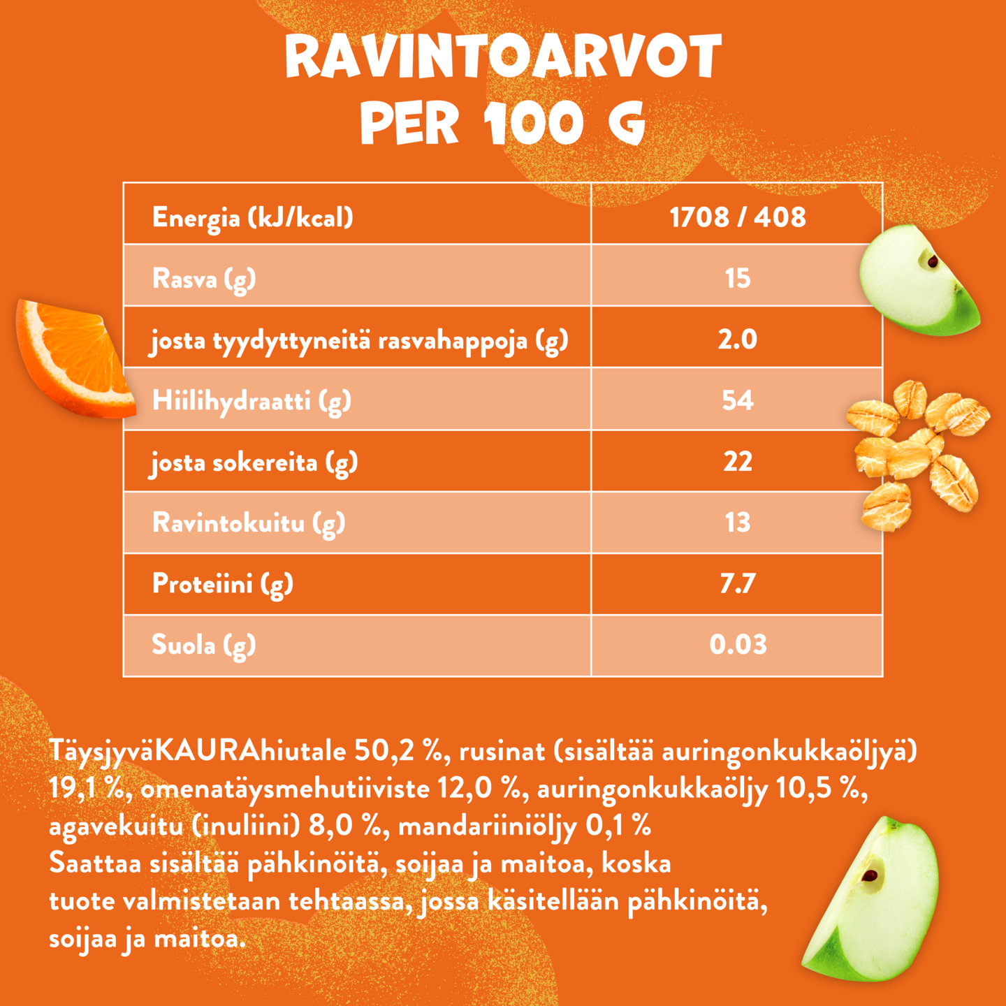 Pehmeä mandariinin ja omenan makuinen kaurapatukka, joka sopii täydellisesti välipalaksi jo pienille lapsille. 50% täysjyväkauraa! Ei lisättyä sokeria.