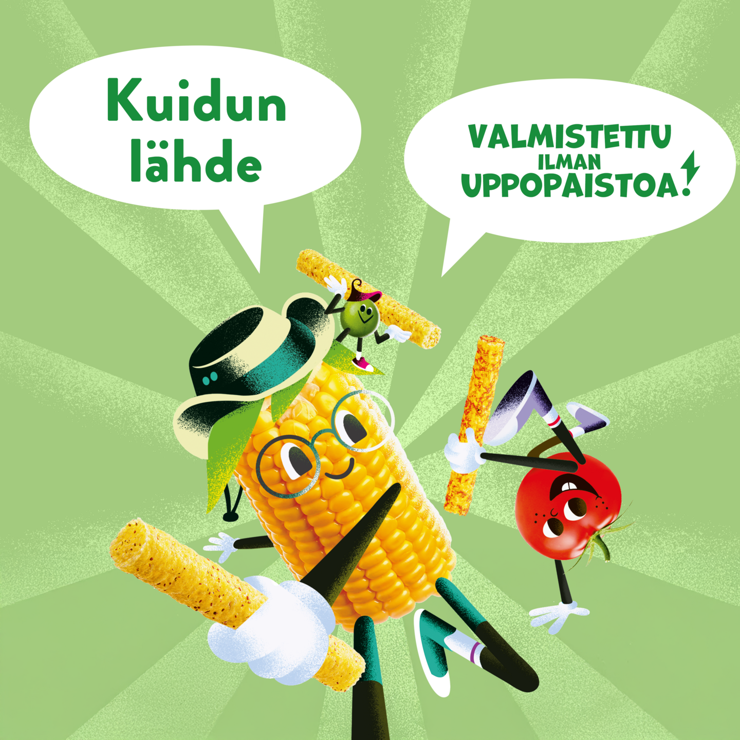 Herneen ja tomaatinmakuiset puffatut maissinaksut lapsille välipalaksi.