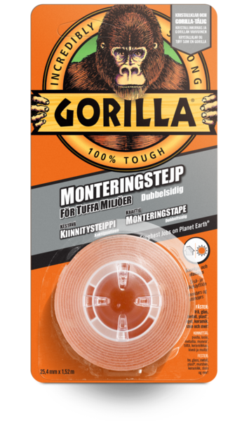 Kirkas ja gorillan vahvuinen kaksipuolinen kiinnitysteippi. Sisä- ja ulkokäyttöön, kiinnittää: puuta, lasia, metallia, muovia, tiiltä, keramiikkaa, kiveä ja muuta! Kestävä Gorilla-kiinnitysteippi on nopea ja vaivaton ratkaisu kiinnitykseen ja korjaukseen. Tämä teollisuustason vahvuinen teippi tarttuu sileisiin ja karkeisiin pintoihin ja tarjoaa välittömän ja säänkestävän kiinnityksen.