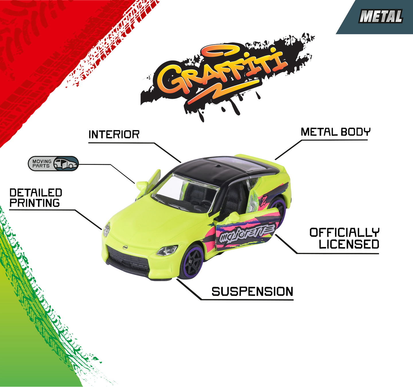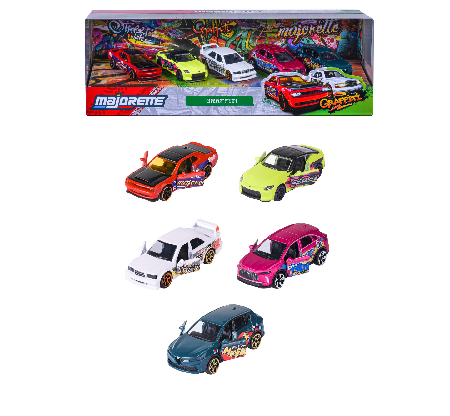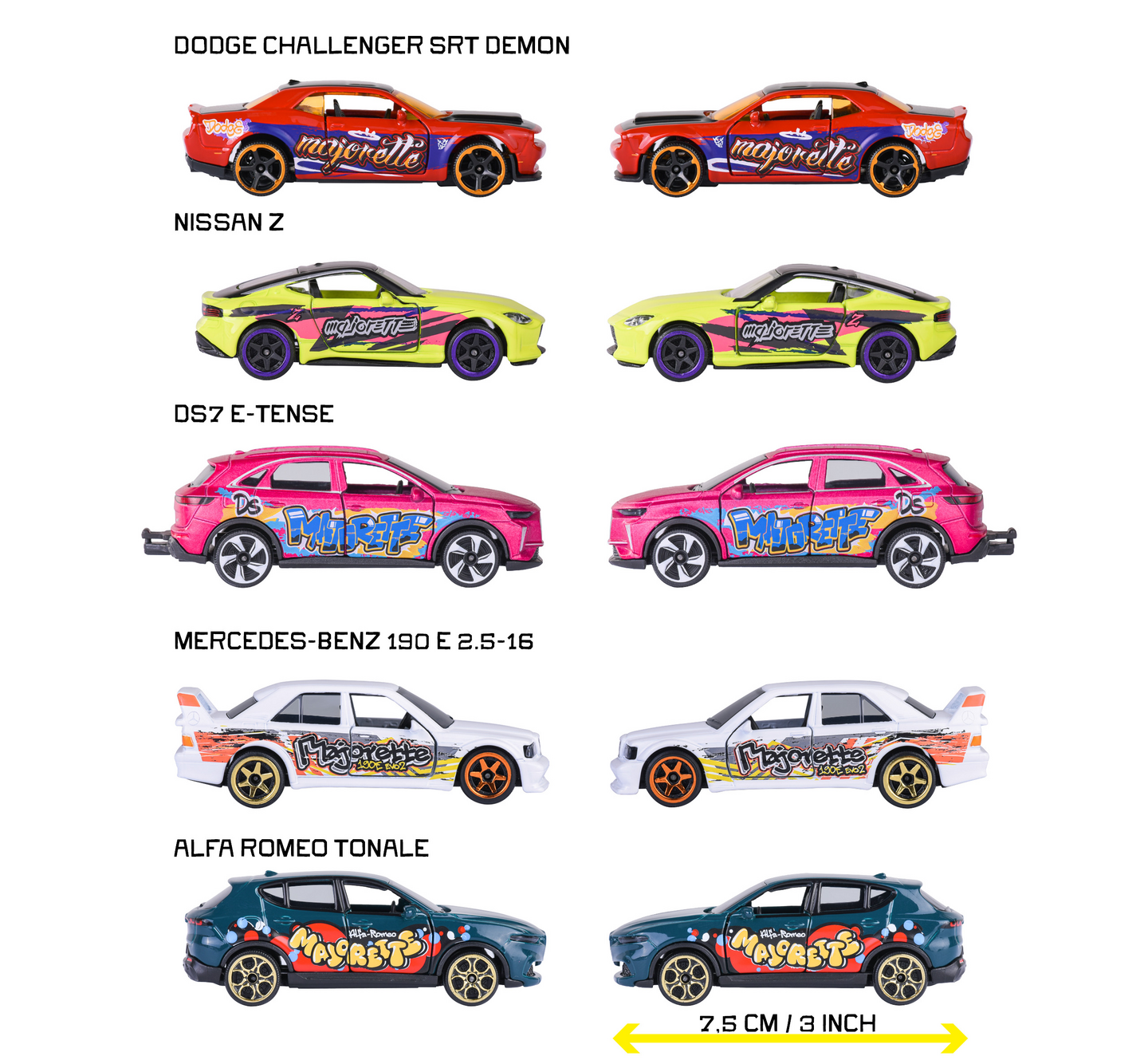 Autopaketti, jossa tyyli ja voima kohtaavat! Dodge Challenger SRT Demon, Mercedes-Benz 190E, Alfa Romeo Tonale, DS7 E-Tense vai Nissan Z – nyt ei tarvitse valita, sillä tämä pakkaus sisältää ne kaikki! Autoissa on aerodynaamista eleganssia ja upeita yksityiskohtia, kuten muotoillut sisätilat, jousitus, avattavia osia ja kylkien maalatut graffitti kuvioinnit! Jokaisessa autossa on vapaasti pyörivät pyörät ja metallinen runko (die-cast), ja kaikki virallisesti aitojen automerkkien lisensoimia. Auton koko 7,5 cm, mittasuhde 1:64. Pinkki DS7-E-Tense ja neonkeltainen Nissan Z saatavilla vain tässä paketissa. Sopii lapsille 3-vuotiaista alkaen, leikkeihin, lahjaksi tai keräiltäväksi.