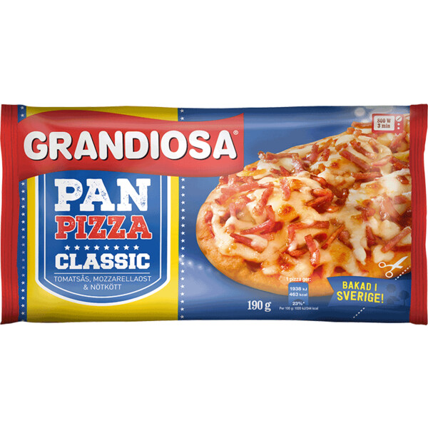 Grandiosa Pan Pizza Classic är Grandiosas mest älskade pizza! Pizzan är toppad med mozzarellaost och nötkött- en enkel smak som många gillar. Som vanligt är det extra mycket topping på pizzan – Mycket av det goda!\n\nDJUPFRYST Förvaring och hållbarhet: I frysutrymme (-18ºC eller kallare): Se Bäst före-märkning. Bör inte frysas efter upptining.