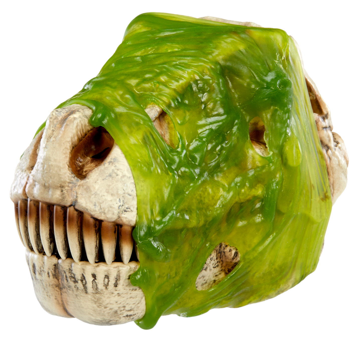 Lisää kalloon vettä ja katso kun se vaahtoaa! Avaa leuat ja kokoa sisältä paljastuvista osista dinosaurus ja syötä se. Purista dinoa sen jälkeen! Dino joko sylkee, räkii tai kakkii limaa! Saatavilla erilaisia.