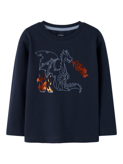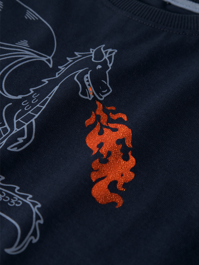 Lasten pitkähihainen, lohikäärme-teemainen trikoopaita. Pyöreä pääntie. Paidassa on pehmeä lohikäärme-kumiprintti, jossa on kiiltävä foliopainatus. Materiaalina on kevyt ja joustava jersey-kangas, jossa on mukavan pehmeä, miellyttävän tuntuinen sisä- ja ulkopinta. Joustavuutensa ansiosta se antaa myös runsaasti liikkumavapautta. Kokoa lapsellesi täydellinen asu laadukkaista arkivaatteista ja luo mukava ja trendikäs tyyli. Tämä paita tuo iloa päivään missä missä tahansa lapsesi liikkuukaan.