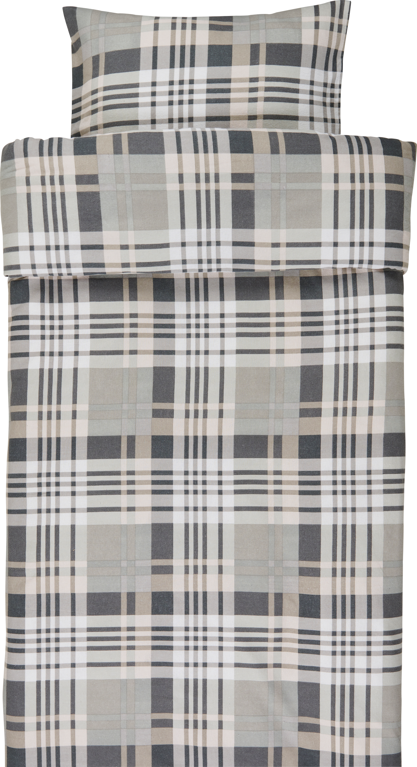 Pussilakanasetti pehmeää ja lämpimän tuntuista puuvillaflanellia, 100 % puuvillaa. Pakkauksessa pussilakana 150 x 210 cm ja tyynyliina 50 x 60 cm. Klassinen ruutukuosi. Oeko-tex.