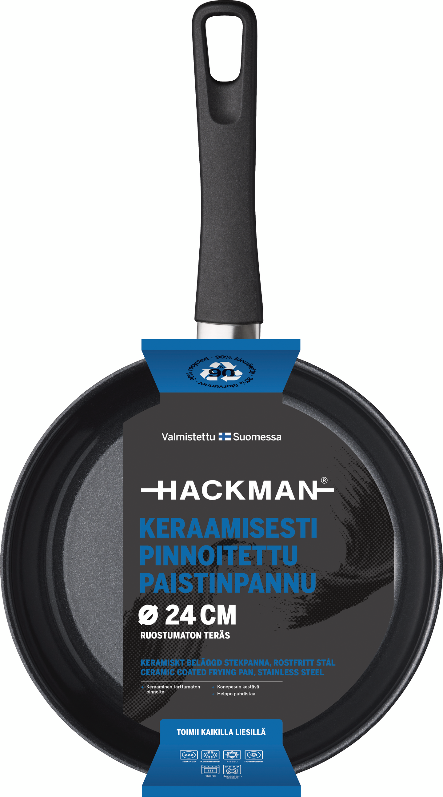 Suomessa valmistettu Hackman teräspannu sopii täydellisesti arjen ruoanlaittoon. Pannun muoviton keraaminen pinnoite on huoleton valinta ruoanlaittoon ja tarjoaa hyvät tarttumattomuusominaisuudet. Sopii kaikille liesille. Pannun runko on valmistettu kestävästä, kierrätetystä ruostumattomasta teräksestä. Miellyttävä kahva takaa hyvän otteen ruokaa laittaessasi eikä kuumene. Tyylikäs harjattu ulkopinta.
