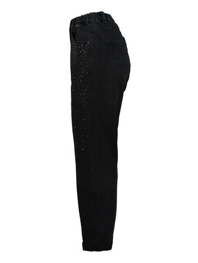 Hyvin istuva korkea vyötärö farkku, jossa yksityiskohtina pienet mustat sydän printit. Vyötärössä kuminauha helpottaa istuvuutta. Lahje kapenee aavistuksen alaspäin