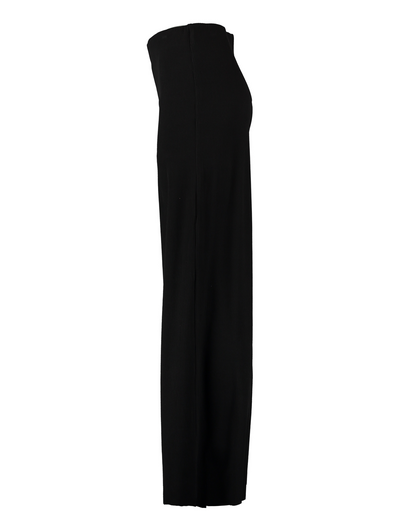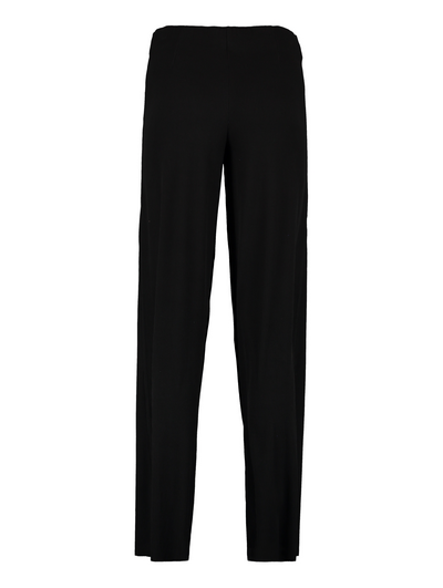 Musta leveä trikoo housu jossa kiva ribattu pinta. Väljä lahje ja leveäkuminauha vyötärö helpottaa istuvuutta