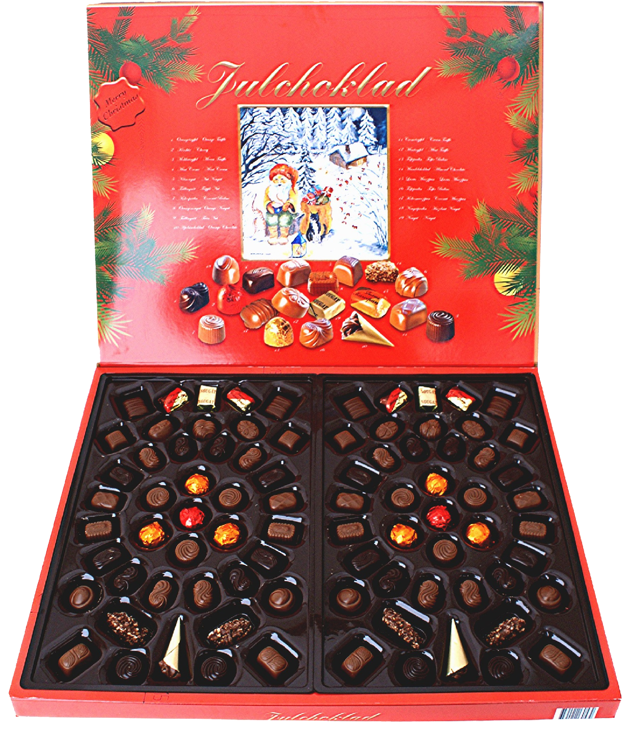 Jättimäinen täytesuklaakonvehtirasia joulupöytään tai lahjaksi. Makuina: appelsiinitryffeli, kirsikka, kahvitryffeli, minttu kerma, pähkinänougat, tripla pähkinänougat, kookostäytesuklaa, appelsiininougat, tupla pähkinä, appelsiinisuklaa, kermatryffeli, minttutryffeli, toffeetäytesuklaa, mantelisuklaa, luxus marsipaani, kookosmarsipaani, hasselpähkinänougat, nougat.