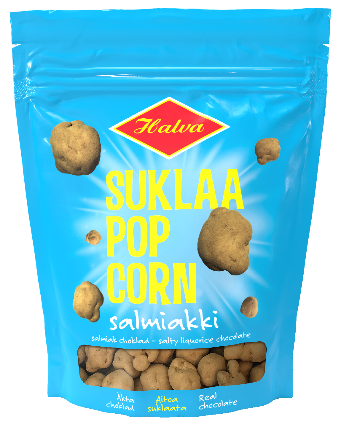 Supertriplamultimaku! Valkosuklaalla kuorrutettuja popcorneja, päällä salmiakkijauhe. Koukuttava nautinto!