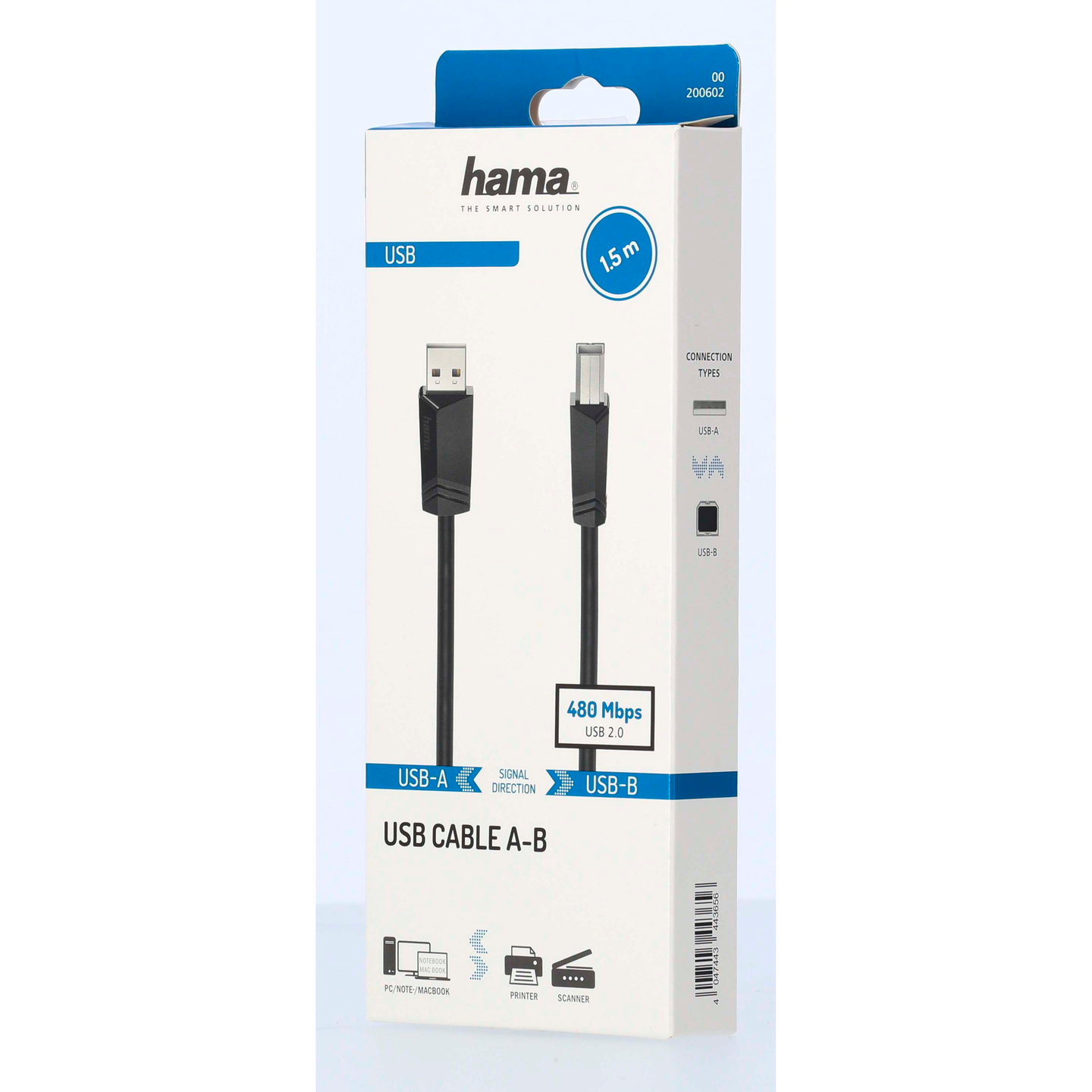 Hama USB-kaapeli USB-A ja USB-B-porteilla varustettujen laitteiden, kuten esim. tietokoneen ja tulostimen tai skannerin väliseen signaalin- ja virransiirtoon. Kaapelissa tehokas kaksinkertainen suojaus sähkömagneettisia häiriöitä vastaan. Tiedonsiirtonopeus jopa 480 Mbit/s. Pituus 1,5 m.