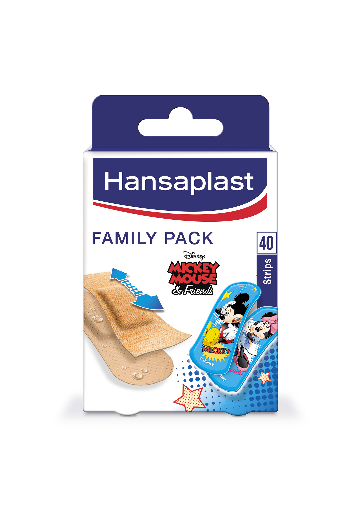 Hansplast Family Pack -laastarilajitelma on tarkoitettu monenlaisiin eri käyttötarkoituksiin koko perheelle. Erilaiset laastarit suojaavat jokapäiväisiä pieniä naarmuja ja haavoja. Pakkaus sisältää joustavia ja hengittäviä laastareita, vettä ja likaa hylkiviä laastareita sekä Disney-aiheisia ihoystävällisiä lastenlaastareita. Tarttumaton haavatyyny suojaa ja pehmustaa haavaa. Hyvä kiinnittyvyys varmistaa laastarin pysymisen paikallaan. Käyttö: Puhdista haava ja pyyhi lika, hiekka ja muut mahdolliset roskat varovasti pois. Kuivaa haavaa ympäröivä iho huolellisesti ja kiinnitä laastari venyttämättä sitä.