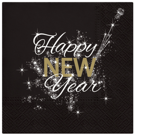 Happy New Year lautasliina uudenvuoden juhlakattaukseen. Lautasliinan koko 33x33cm ja paketissa 20 kappaletta. Yhdistä lautasliinat saman sävyisten lautasten ja mukien kanssa.