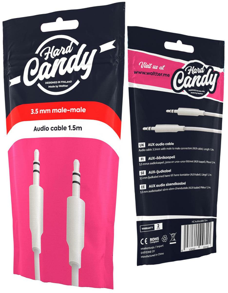 1,5 metrisellä Hard Candy -audiokaapelilla voit kytkeä esimerkiksi mobiililaitteesi tai MP3-soittimesi suoraan kuulokeliitännästä autoradion, tietokoneen tai muun laitteen kolmipinniseen 3,5 mm AUX-linjasisääntuloon. Edullisuudestaan huolimatta Hard Candy Made by Waltter on luotettava suomalainen tuotemerkki, jonka tuotteet ovat kehitetty Suomessa ja testattu täyttämään korkea suomalainen vaatimustaso. Kaikilla Hard Candy -tuotteilla on kahden vuoden takuu.