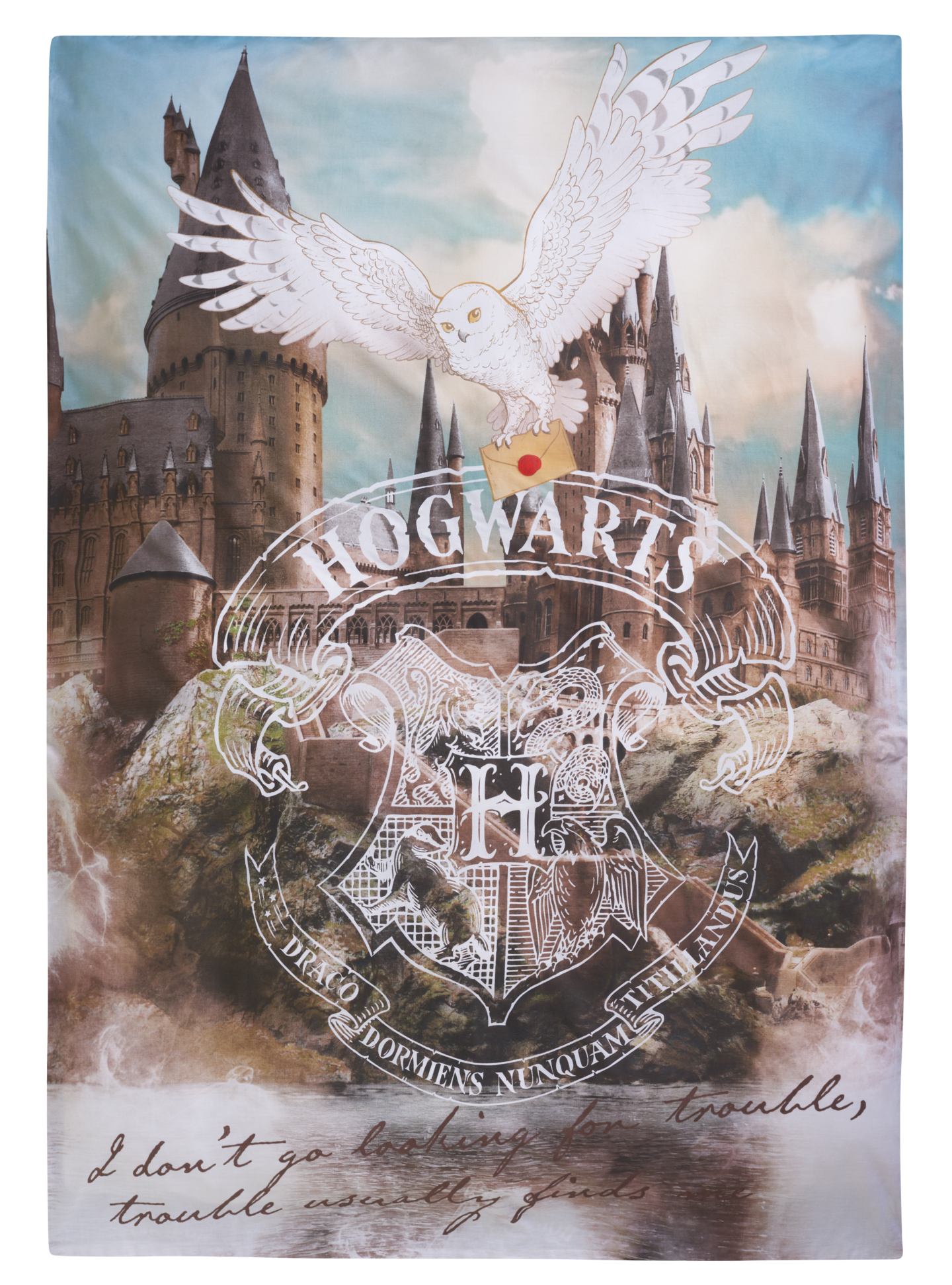 Pussilakanasetissä kuvattuna Tylypahkan vaakuna sekä Harry Potterin lemmikkipöllö Hedwig. Pakkauksessa pussilakana 150x210 cm ja tyynyliina 50x60 cm. 100% puuvillaa. Pesu 60 astetta.
