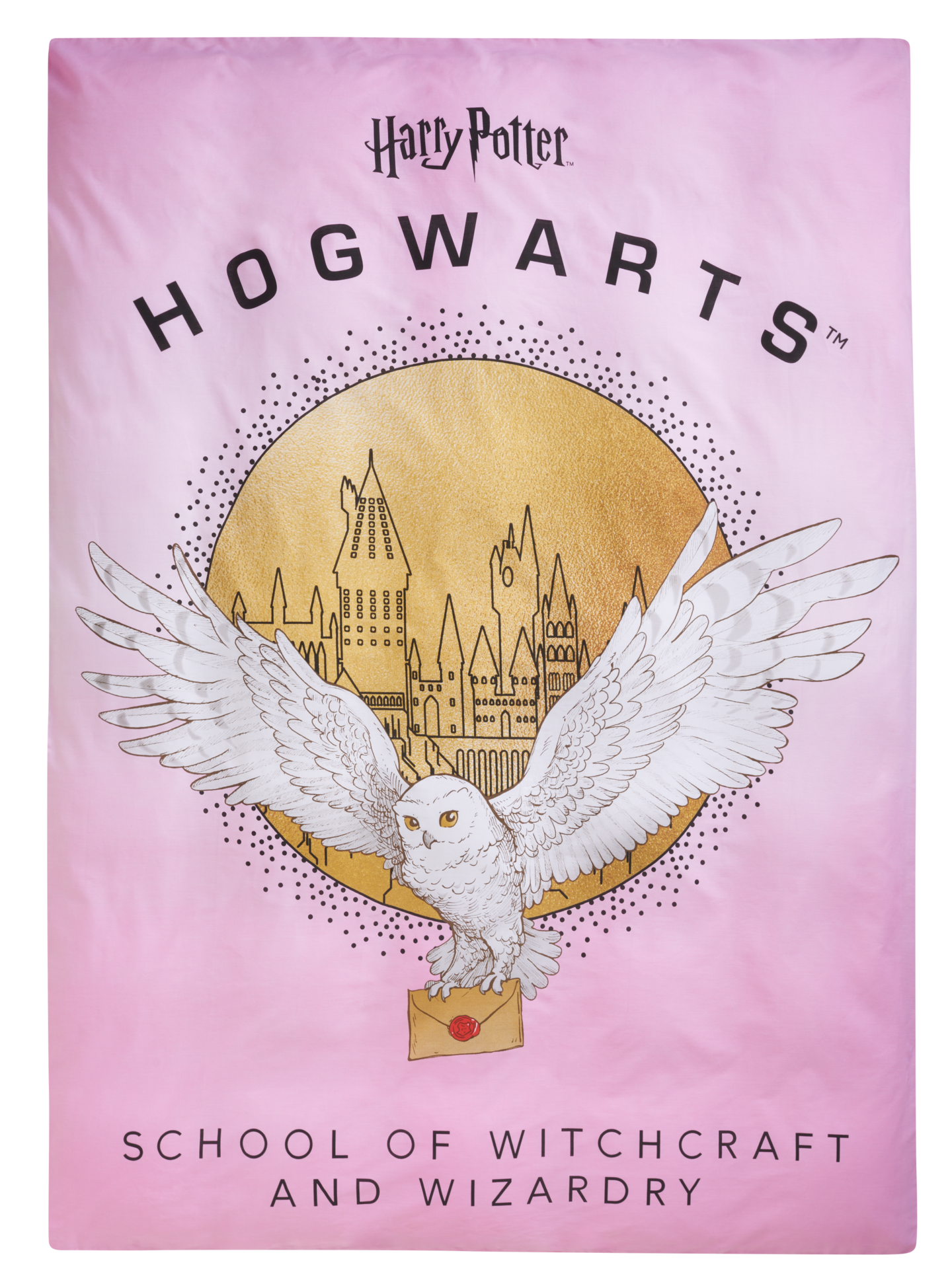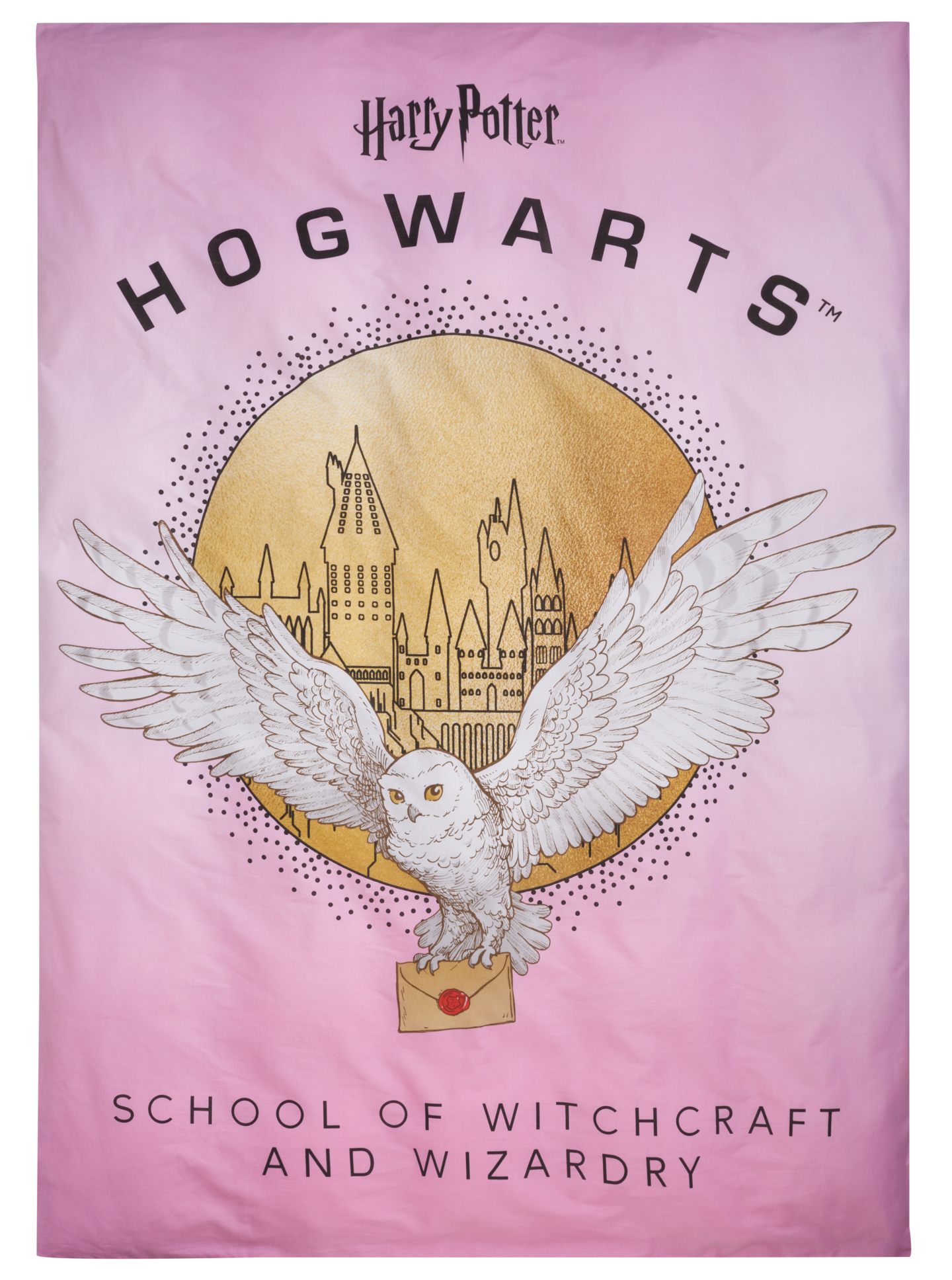Pussilakanassa Harry Potterin lemmikkipöllö Hedwig kuljettaa sinetöidyssä kirjeessä viestiä taikamaailmasta. Pakkauksessa pussilakana 150x210 cm ja tyynyliina 50x60 cm. 100% puuvillaa. Pesu 60 astetta.