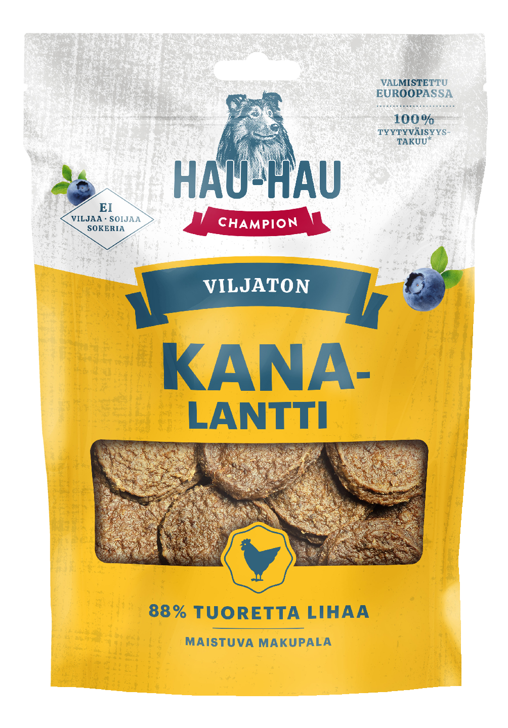 - Viljaton koiranherkku - 88 % tuoretta lihaa - Ei viljaa, soijaa tai sokeria - Helppo paloitella murustelematta - Valmistettu Virossa, suunniteltu Suomessa Hau-Hau Champion Viljaton Kanalantti on tuoreesta lihasta valmistettu, erittäin maistuva koiranherkku. Kanalantit on leivottu lihaisasta taikinasta, johon on lisätty marjapuristetta, mutta ei lainkaan viljaa, soijaa tai sokeria. Tuloksena on kuin kotona leivottu makupala, joka sujahtaa näppärästi lenkkitakin taskuun murustelematta. Tämä herkku on myös helppo murtaa pienemmiksi koiran nameiksi. Lanteissa käytetyt marjapuristeet syntyvät kylmäpuristettujen mehujen sivutuotantona. Niiden sisältämät marjojen kuoret ja siemenet ovat marjojen ravintorikkaimmat osat, ja siemenöljy sisältää runsaasti monityydyttymättömiä rasvahappoja. Suomessa suunnitellut Viljattomat koiranherkut valmistetaan Hau-Haun omalla tehtaalla Virossa.