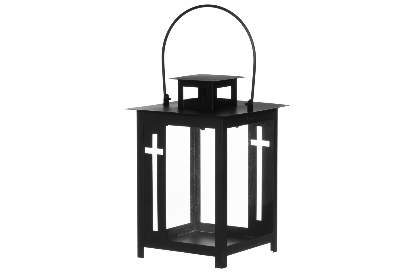 Kaunis metallinen hautalyhty koristeleikkauksella (risti). Lyhdyn voi ripustaa pidikkeeseen tai asettaa haudalle.
