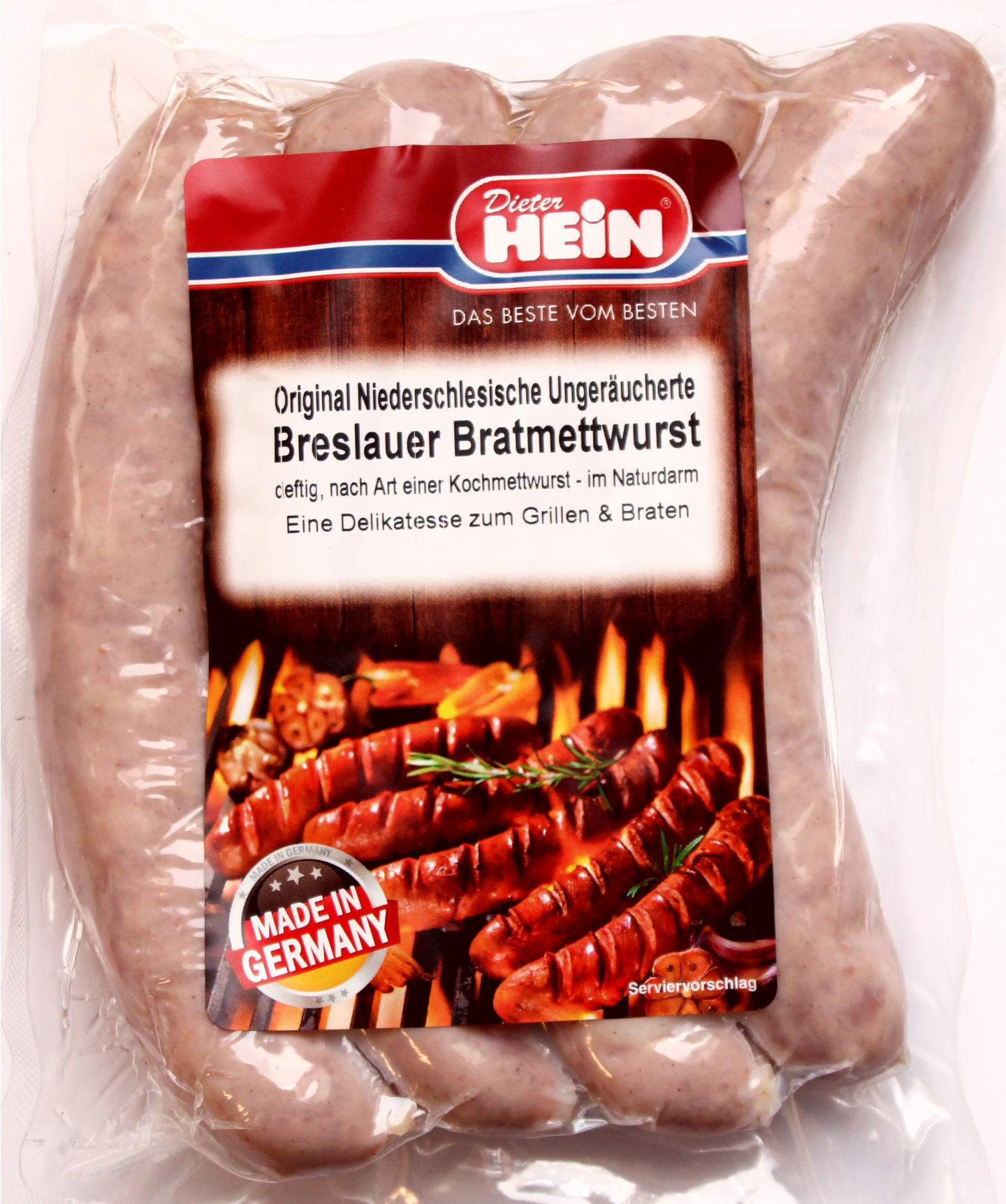 Aito saksalainen savustamaton porsaanlihamakkara luonnonsuolessa 4 x 90 g. Kypsä tuote.