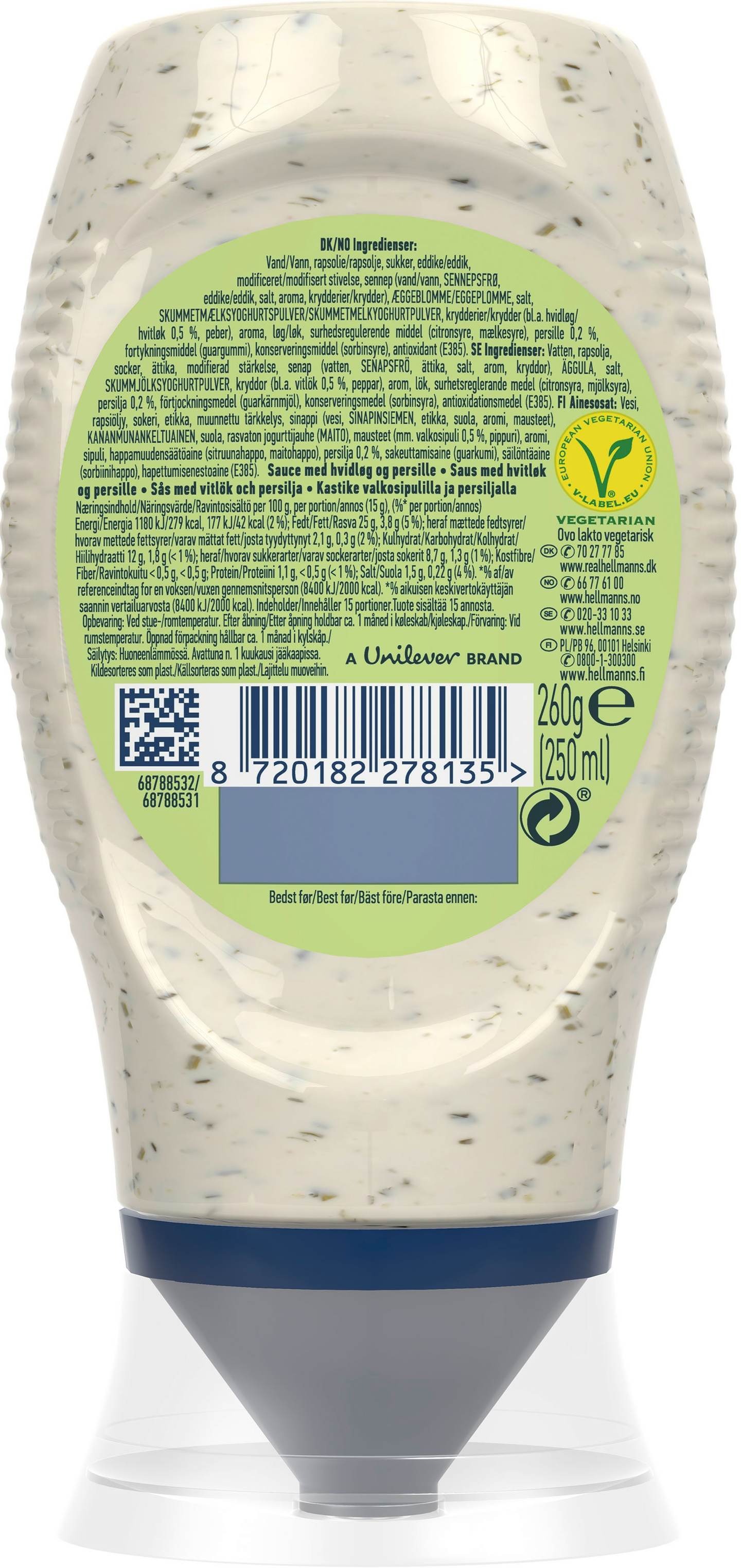 Hellmann's Fries Sauce on herkullinen, täyteläinen valkosipulin ja yrttien makuinen kastike niille, jotka haluavat vaihtoehdon klassisille maustekastikkeille, ketsupille, majoneesille. Pirskota Hellmann'sia ranskalaisten perunoiden, täytettyjen voileipien, vihannesten tai kanaruokien päälle. Hellmann's Fries -kastike on monipuolinen kastike, jota voit käyttää makusi mukaan monenlaisiin ruokiin. Ei lisättyä sokeria. Me Hellmann’silla rakastamme ruokaa. Uskomme, että hyvä ruoka syntyy parhaista raaka-aineista. Siksi olemme päättäneet valmistaa tuotteemme niin yksinkertaisista ja luonnollisista raaka-aineista kuin mahdollista. Pyrimme käyttämään mahdollisimman pitkälti kestävän kehityksen periaatteiden mukaisia raaka-aineita. Lisäksi etsimme aina uusia tapoja minimoida ympäristövaikutustamme. Olemme jo pitkään olleet sitoutuneet kestävään viljelyyn, vastuulliseen liiketoimintaan ja koko Hellmann’s-tuotantoketjun oikeudenmukaiseen kohteluun. Emme toimi näin pelkästään siksi, että uskomme sen tekevän tuotteistamme parempia vaan myös siksi, että se on oikein. Sen vuoksi käytämme ainoastaan vapaiden kanojen munia ja ostamme majoneesissa käytetyn öljyn 100-prosenttisen vastuullisesti. Panostamme myös muovijätteen vähentämiseen. Siksi herkullinen kastikkeemme on pakattu 100-prosenttisesta kierrätysmuovista valmistettuun pulloon – aito maku, vähemmän jätettä. Hellmann's –100 vuotta hyvää makua. Richard Hellmann avasi herkkupuodin New Yorkiin vuonna 1905 ja alkoi myydä siellä omaa majoneesiaan. Resepti oli hänen vaimonsa käsialaa. Hellmann viimeisteli majoneesipurkit solmimalla siniset rusetit niiden ympärille. Majoneesista tuli todella suosittua, ja Hellmann piti sinisen rusetin mukana myös suunnitellessaan uutta logoa