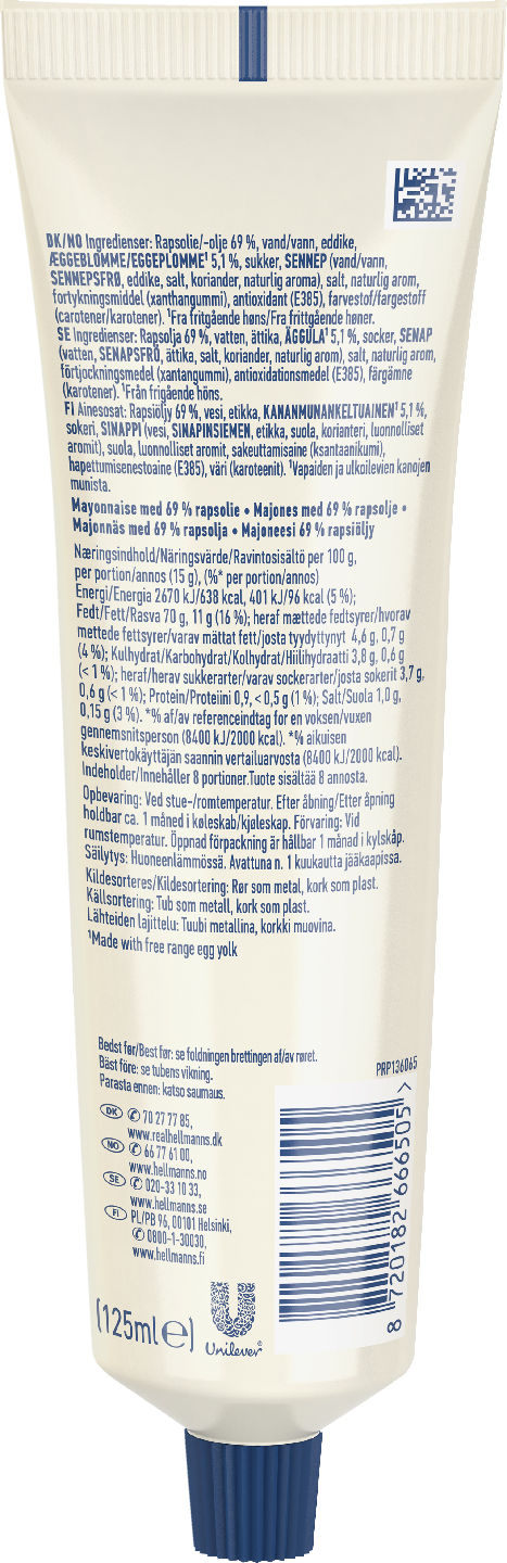 Hellmann's majoneesi on kätevässä tuubipakkauksessa, josta saat annosteltua tarkasti haluamasi määrän majoneesia. Pienempi koko on helppo ottaa mukaan esimerkiksi kesäpiknikille, grilli-iltaan tai talviretkelle hot dogien kanssa. Hellmann's majoneesissa on kermainen rakenne sekä tasapainoinen ja klassinen maku. Majoneesin perinteinen maku, sopii täydellisesti klassisempien ruokien, kuten katkarapujen ja merenelävien, katkarapuvoileipien, munavoileipien, hampurilaisten ja hot dogien kanssa. Klassinen Hellmann's majoneesi kätevässä tuubissa maustaa mainiosti myös nykyään hyvin trendikkäitä ruokia ja välipaloja, kuten tacot, sushit, bowlit, grillatut voileivät tai wrapit. Hellmann's tuubimajoneesi on aito majoneesi, joka saa lähes herkun kuin herkun maistumaan paremmalta. Hellmann's majoneesi on valmistettu rypsiöljystä ja vapaan kanan munan keltuaisista. Tuubista annosteltava klassinen majoneesi eroaa Hellmann's Real majoneesista, jolla on amerikkalaisempi makuprofiili. Voit nauttia Hellmann'sin herkullisesta majoneesista hieman miedommalla ja klassisemmalla maulla. Hellmann'sin majoneesi on tehty sinulle, joka haluat nauttia hyvästä ruoasta. Uskomme, että hyvä ruoka syntyy parhaista raaka-aineista. Siksi olemme päättäneet valmistaa tuotteemme niin yksinkertaisista ja luonnollisista raaka-aineista kuin mahdollista, kuten vapaiden ja ulkoilevien kanojen munista. Pyrimme käyttämään mahdollisimman pitkälti kestävän kehityksen periaatteiden mukaisia raaka-aineita. Lisäksi etsimme aina uusia tapoja minimoida ympäristövaikutustamme. Ruoka maistuu herkulliselta Hellmann’sin majoneesin kanssa. Mutta tiesitkö, että voit käyttää tuotteitamme myös ruoanvalmistuksessa ja leivonnassa? Hellmann’s-tuotteilla saat uudenlaisia jännittäviä makuja alkupaloihin, pääruokiin, leivonnaisiin ja lisukkeisiin. Ei ihme, että Hellmann's on maailman suosituin majoneesi!