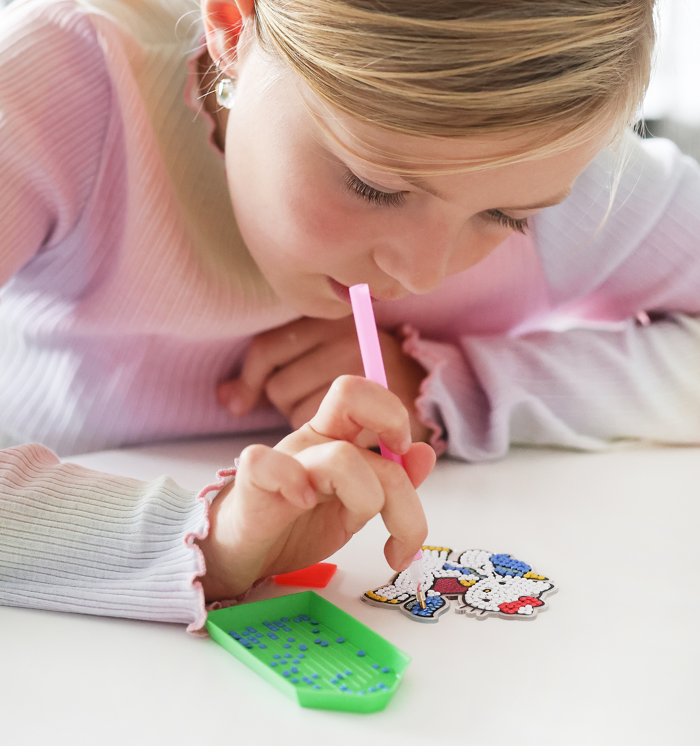 Hello Kitty & Friends timanttihelmi-askertelu ja maalaussetti. Voit ottaa tekemäsi kuvan mukaan kiinnittämällä siihen settiin kuuluvan avaimenperän. Pakkaus sisältää 1 magic kynän, 1 kiinnitysalustan, 1 avaimenperän, 1 taustakuvan, 5 pussia (n.350 kpl) erivärisiä askarteluhelmiä ja 1 tarjotin helmille. Ikäsuositus 5+.