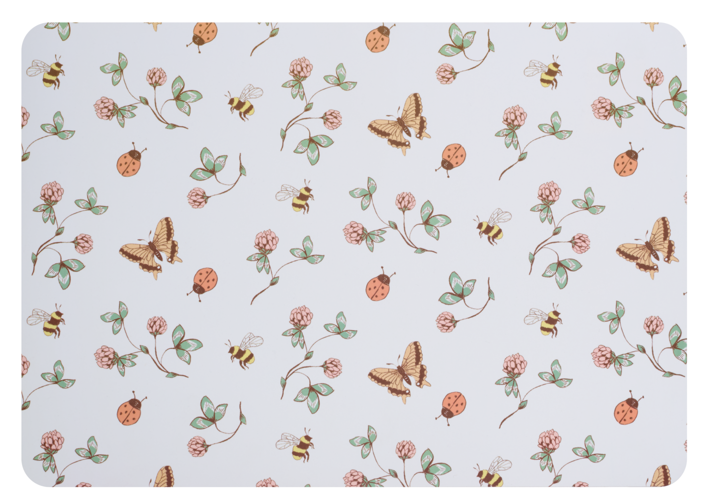 Bee With Me lasten pöytätabletissa on vaalealla taustalla pörriäisiä, perhosia ja leppäkerttuja apilankukkien lomassa. Pöytätabletti suojaa pöytää tahroilta ja tuo piristystä kattaukseen. Muovinen pöytätabetti on helppo puhdistaa kostealla liinalla.