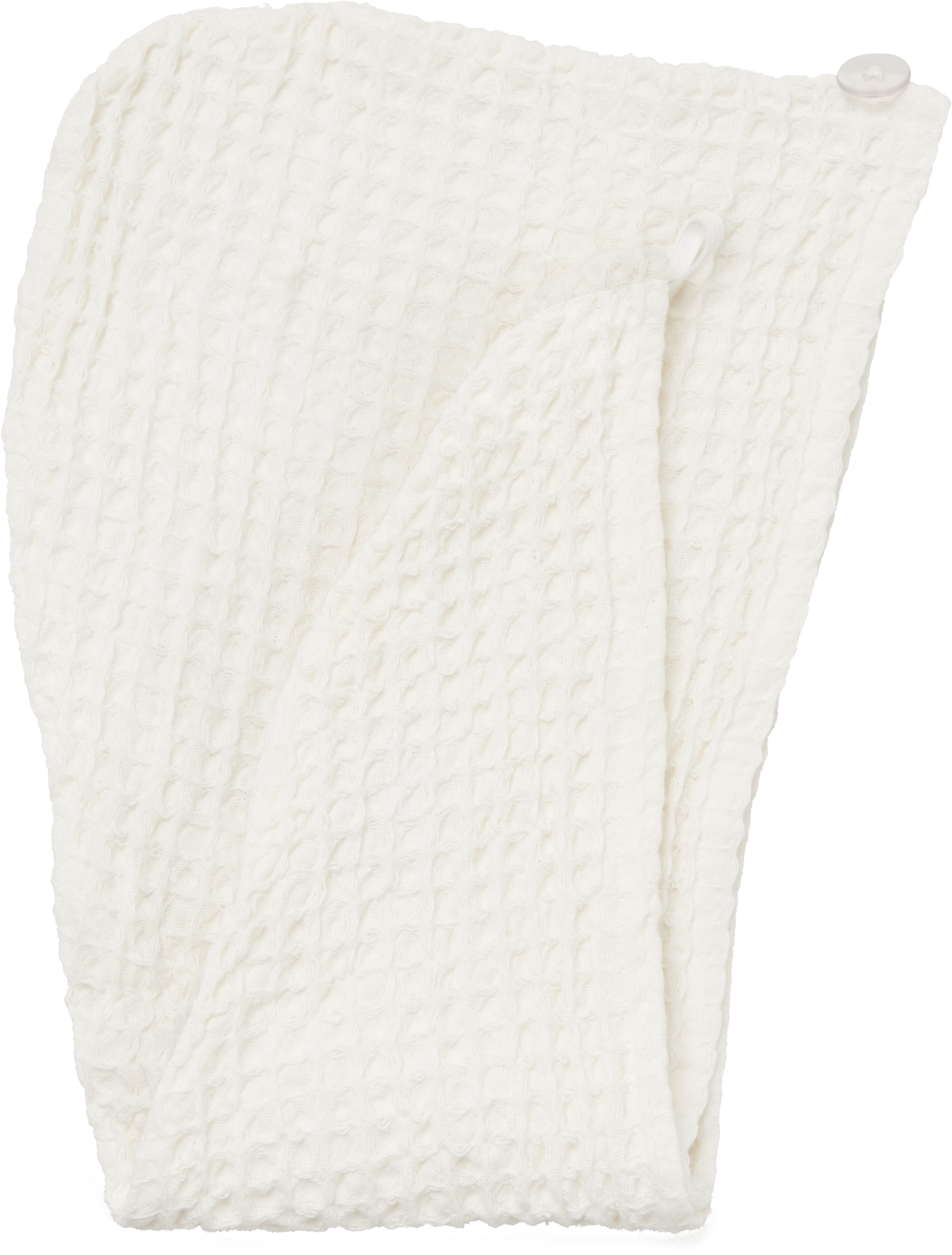 Vohvelikankainen hiuspyyhe, 100 % puuvillaa. Koko 63 x 25 cm. Huppumainen hiuspyyhe on näppärä kietaista turbaaniksi nappikiinnityksellä. Pyyhettä voi käyttää suojaamaan hiuksia esimerkiksi kuumassa saunassa. Väri valkoinen.
