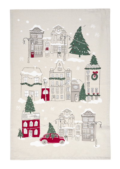 Puuvillaisessa keittiöpyyhkeessä on vaalealla pohjalla jouluinen kaupunkinäkymä.