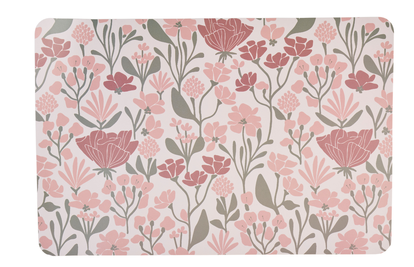 Jessie pöytätabletissa on vaaleanpunaisella taustalla kukkia ja lehtiä. Pöytätabletin materiaali on tavalliseen muovitablettiin verrattuna hieman paksumpaa ja pehmeämpää. Pöytätabletti suojaa pöytää tahroilta ja tuo piristystä kattaukseen. Muovinen pöytätabetti on helppo puhdistaa kostealla liinalla.