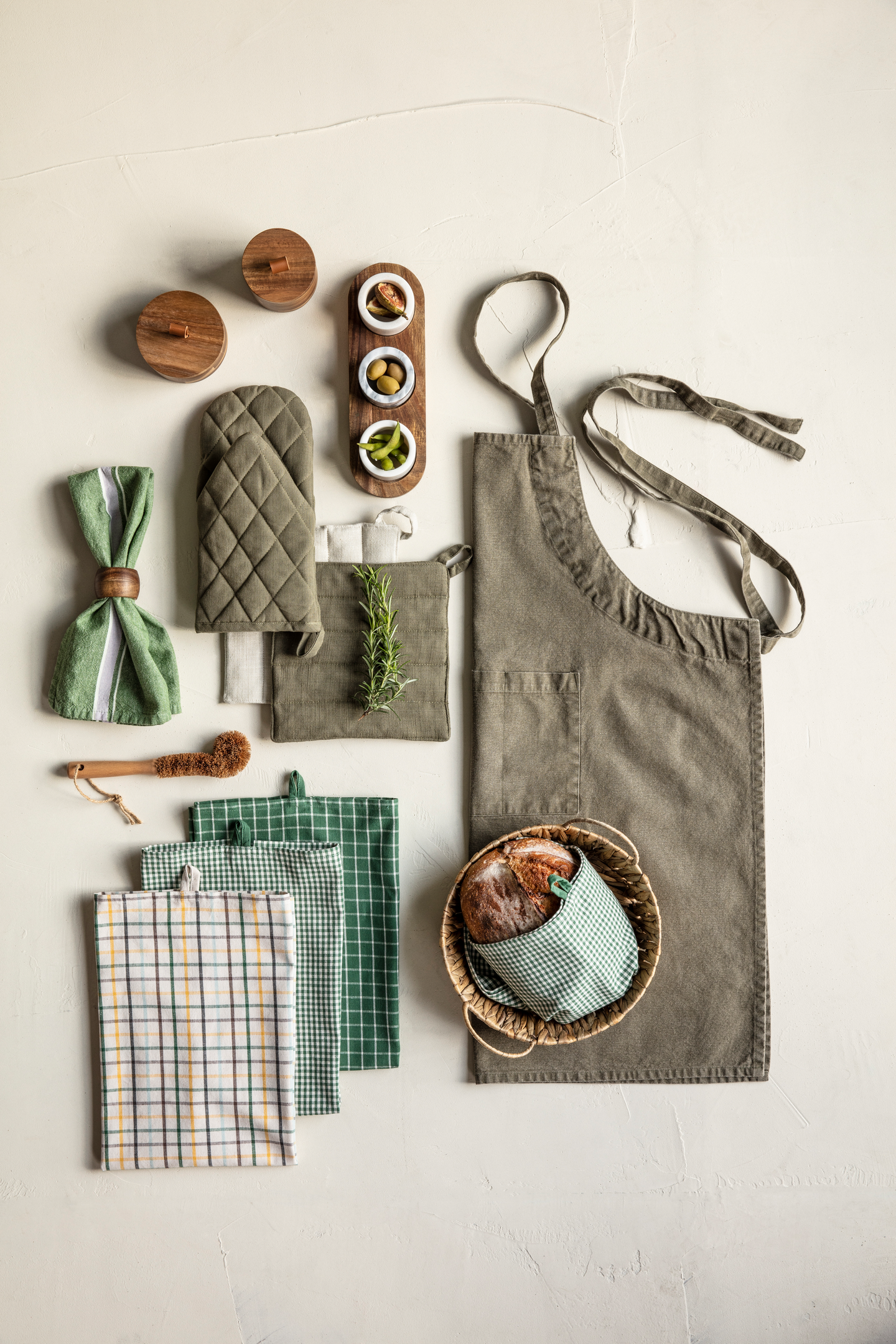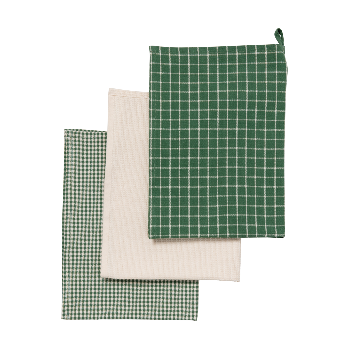 Kolmen kappaleen keittiöpyyhesetti Blair. Setissä kaksi vihreäruudullista ja yksi luonnonvalkoinen keittiöpyyhe. Koko 50 x 70 cm. Materiaali 100% puuvilla.