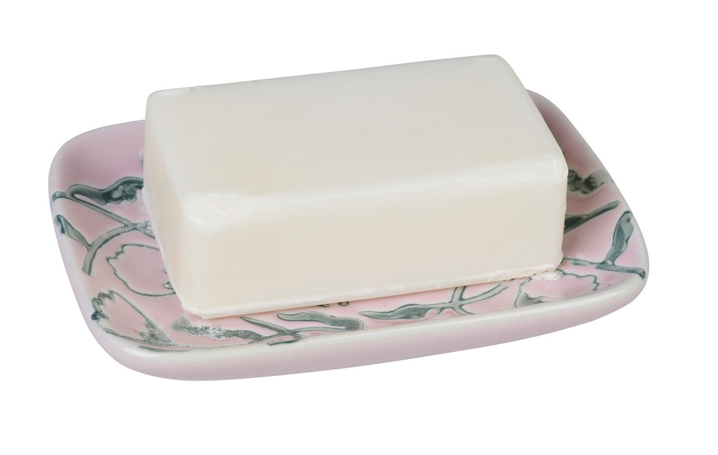 Vaaleanpunaisen saippualautasen pinta on koristeltu vihreällä lehti- ja oksakuvioinnilla. Materiaali keramiikkaa.