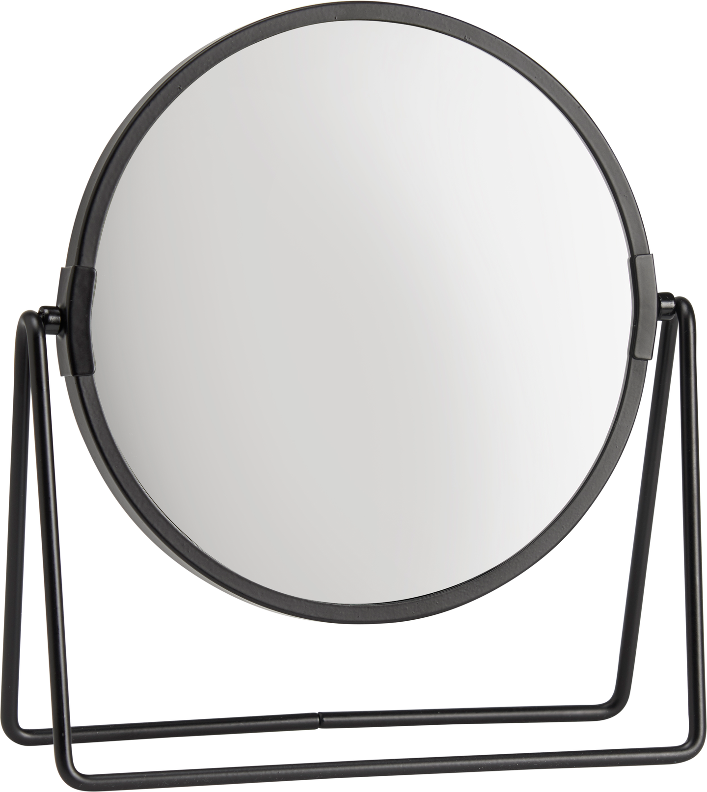 Pöytäpeili, mustilla metallikehyksillä. Pyöreä kääntyvä peliosa, toisella puolella suurentava meikkipeili. Koko 16,3 x 6,5 x 23 cm.