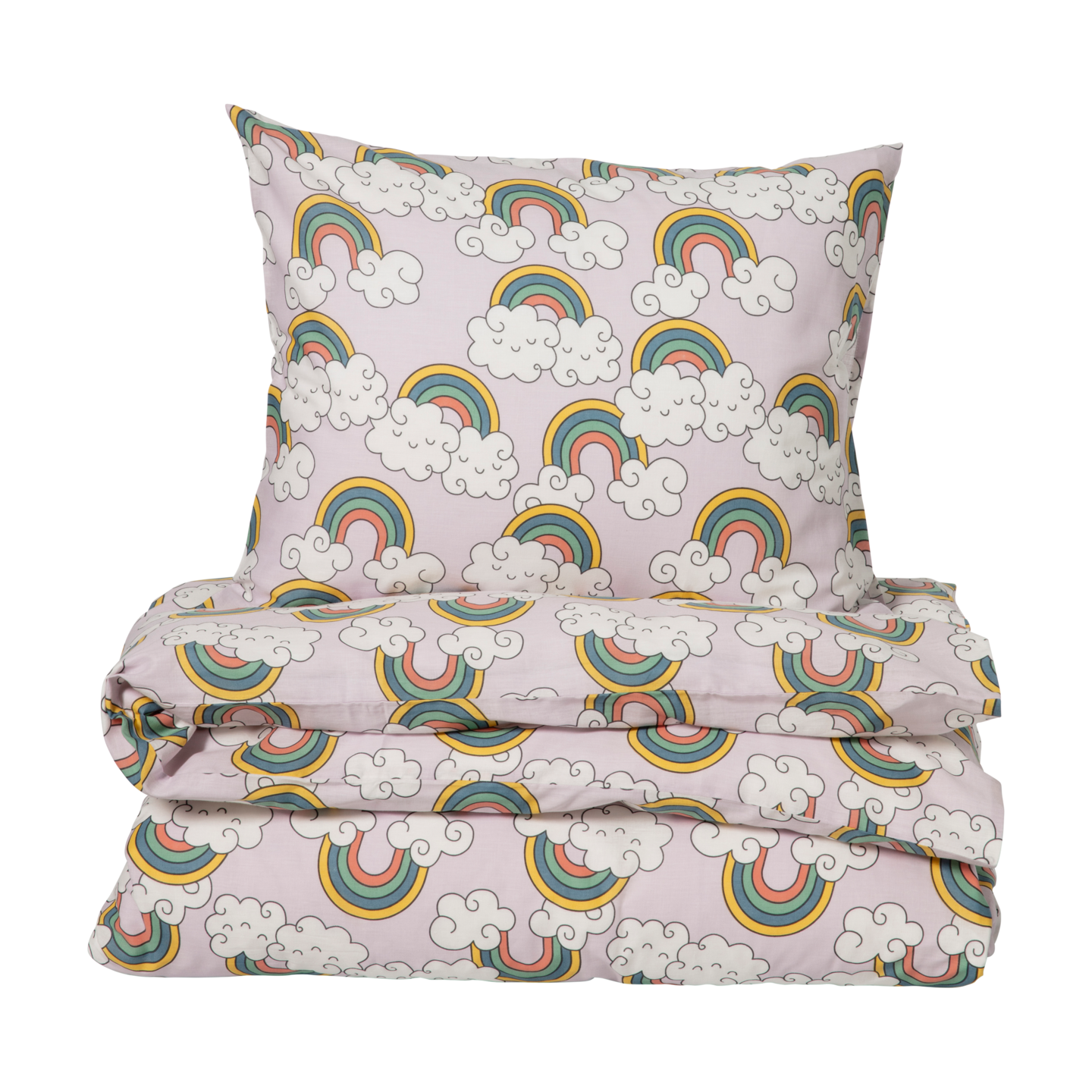 Liana lasten pussilakanasetissä on valkoisella pohjalla pilviä ja sateenkaaria. Setti sisältää 150 x 210 cm kokoisen pussilakanan sekä 50 x 60 cm kokoisen tyynyliinan. Setti on valmistettu pehmeästä GOTS-sertifioidusta puuvillasta.