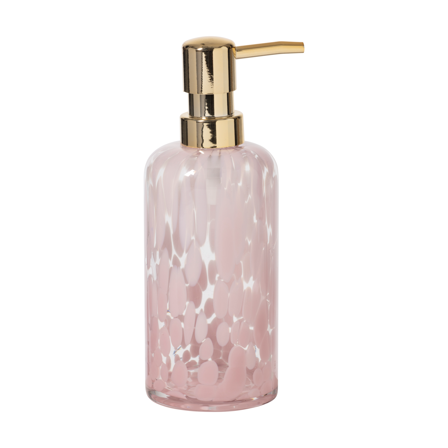 Saippua-annostelija on koristeltu vaaleanpunaisilla pilkuilla. Materiaali lasi.