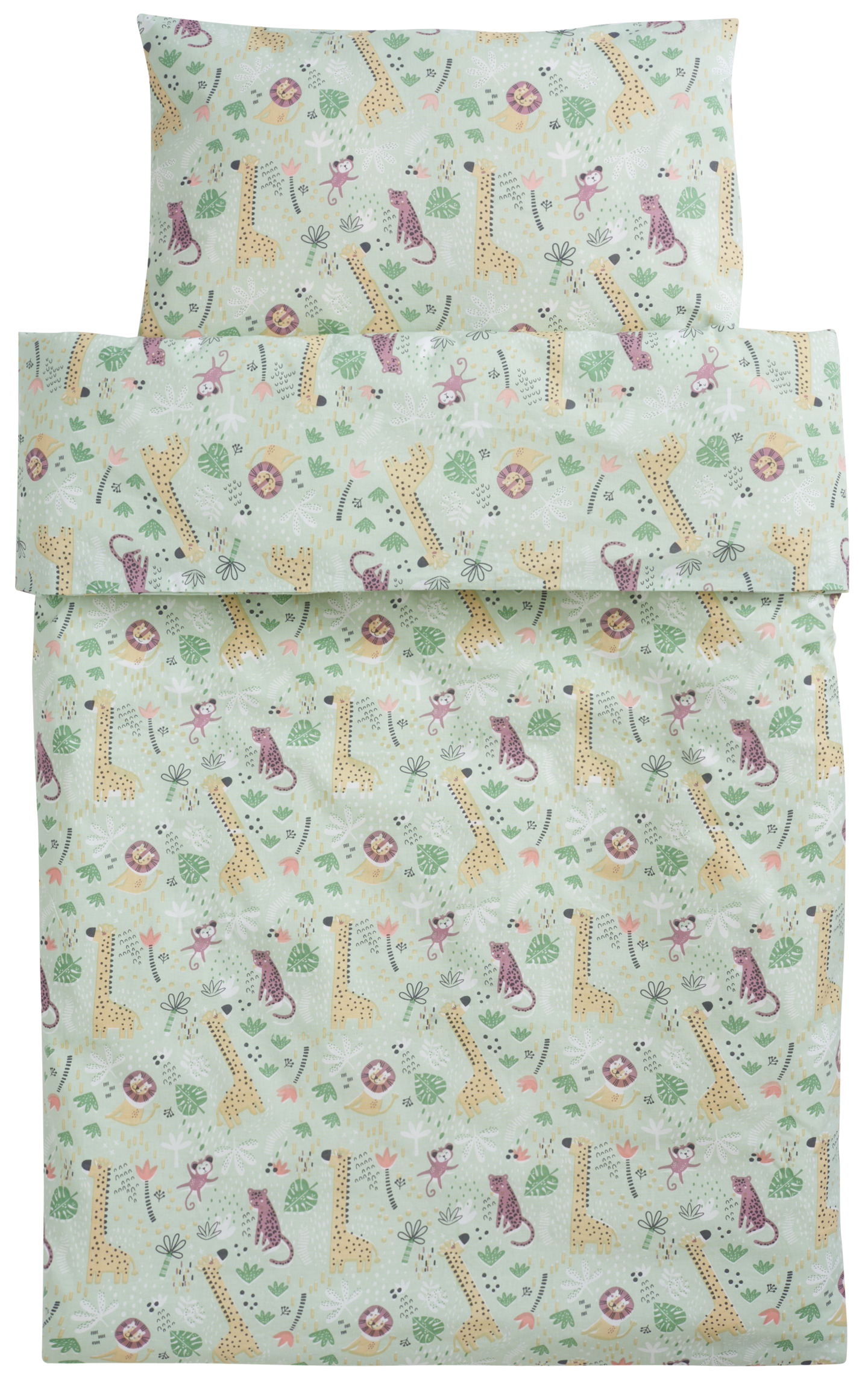Safari vauvan pussilakanasetissä vaaleanvihreällä pohjalla viidakon eläimiä. Setti sisältää 100 x 130 cm kokoisen pussilakanan sekä 38 x 55 cm kokoisen tyynyliinan. Setti on valmistettu pehmeästä GOTS-sertifioidusta puuvillasta.
