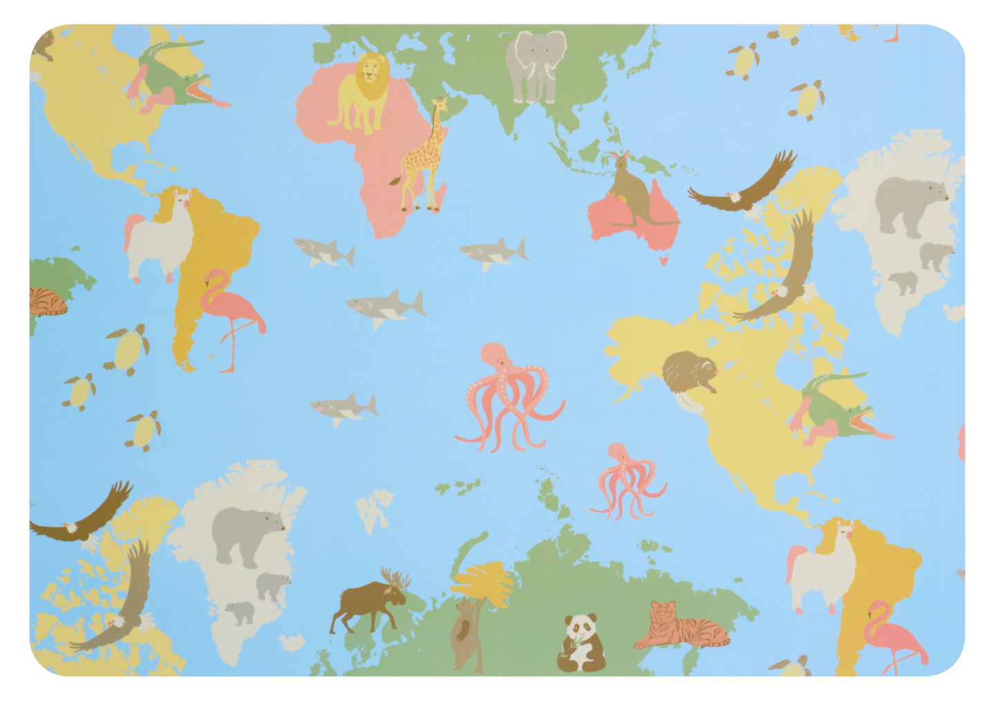 Your World lasten pöytätabletissa on kuvattuna maapallon eri mantereet ja niiden paikalliselämet. Pöytätabletti suojaa pöytää tahroilta ja tuo piristystä kattaukseen. Muovinen pöytätabetti on helppo puhdistaa kostealla liinalla.