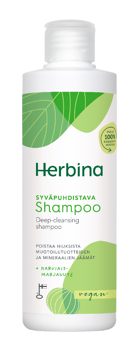 Herbina Syväpuhdistava Shampoo poistaa tehokkaasti mm. muotoilutuotteiden jäämät ja uimahallista hiuksiin tarttuneen kloorin. Shampoon karviaisuutetta sisältävä koostumus kosteuttaa ja hoitaa hiuksia tehden niistä ilmavan tuntuiset. Sisältää 92% luonnollista alkuperää olevia raaka-aineita. Tuote valmistetaan Itä-Suomessa Heinävedellä ja tuotteelle on myönnetty Avainlippu-tunnus.