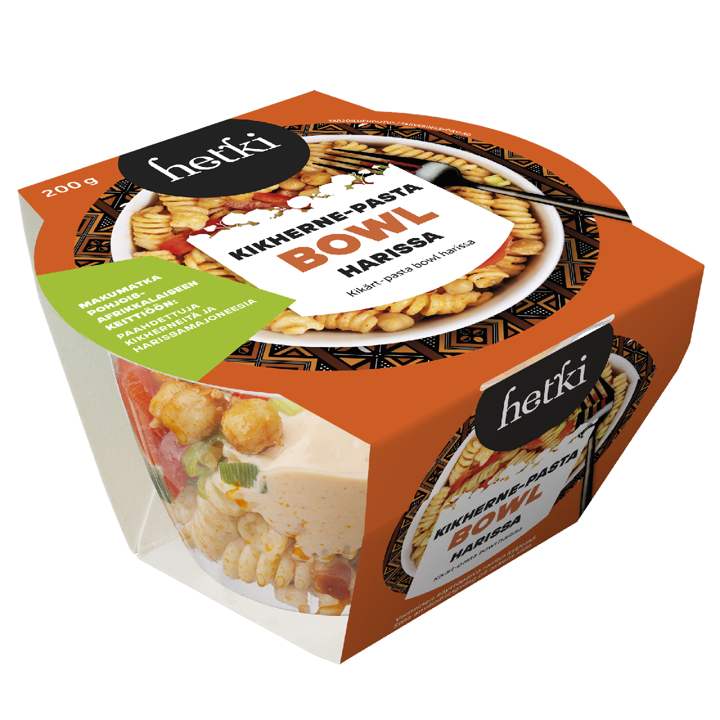 Kikherne-pasta bowl "harissa” tarjoilee pohjois-afrikkalaisen keittiön makuja. Salaatissa on maustettua pastaa, paahdettuja kikherneitä, harissamajoneesia sekä tuoretta paprikaa ja kevätsipulia. Hetki Bowlit ovat salaatteja, jotka sopivat tuhdiksi välipalaksi tai pieneksi lounaaksi.