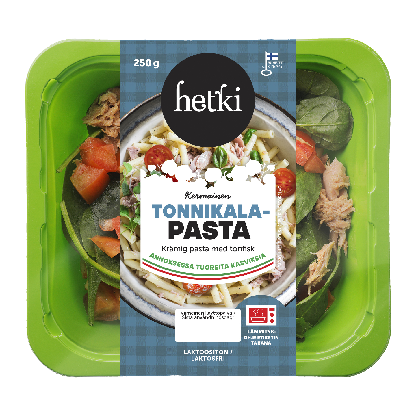 Maukas pasta-ateria mikroon! Annoksessa on maustettua pastaa, tonnikalaa, kermaista juustokastiketta sekä tuoretta tomaattia ja babypinaattia. Kermainen tonnikala-pasta on proteiinin lähde. LAKTOOSITON Löydät Hetki-mikroateriat kaupoista nyt uusissa vihreissä pakkauksissa.