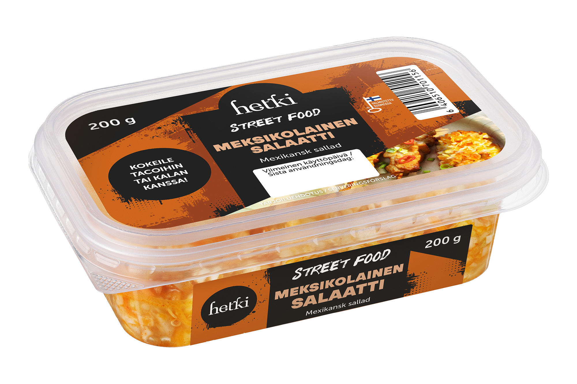 Meksikolaisittain maustettu lisukesalaatti, jossa on kaalia, porkkanaa ja purjosipulia. Kokeile Meksikolaista salaattia tacojen täytteeksi! VEGAANINEN Meksikolainen salaatti kuuluu Hetki Street Food -lisukesalaatteihin. Street Food -lisukesalaateilla saat herkulliset täytteet helposti erilaisiin street food annoksiin. Kokeile myös grillatun ruoan lisukkeeksi! Testaa herkullista reseptiä: PULLED VAMOS VAMOS TACOS Tarvitset: pieniä maissi- tai vehnätortilloja revittyä possua, kanaa tai tofua majoneesia Hetki Street Food Meksikolainen -salaattia avokadoa limeä tuoretta korianteria - Kypsennä tai lämmitä revitty possu, kana tai tofu pakkauksen ohjeen mukaisesti. - Lämmitä pienet maissi- tai vehnätortillat miedolla lämmöllä kuivalla paistinpannulla. - Aloita kokoaminen laittamalla lämmitetyn tortillan päälle ruokalusikallinen majoneesia ja lisää revittyä haluamaasi proteiinia. - Lisää avokadon viipaleita ja Hetki Street Food Meksikolaista salaattia. - Viimeistele taco puristamalla hieman limen mehua tacon päälle ja koristele tuoreilla korianterin lehdillä.