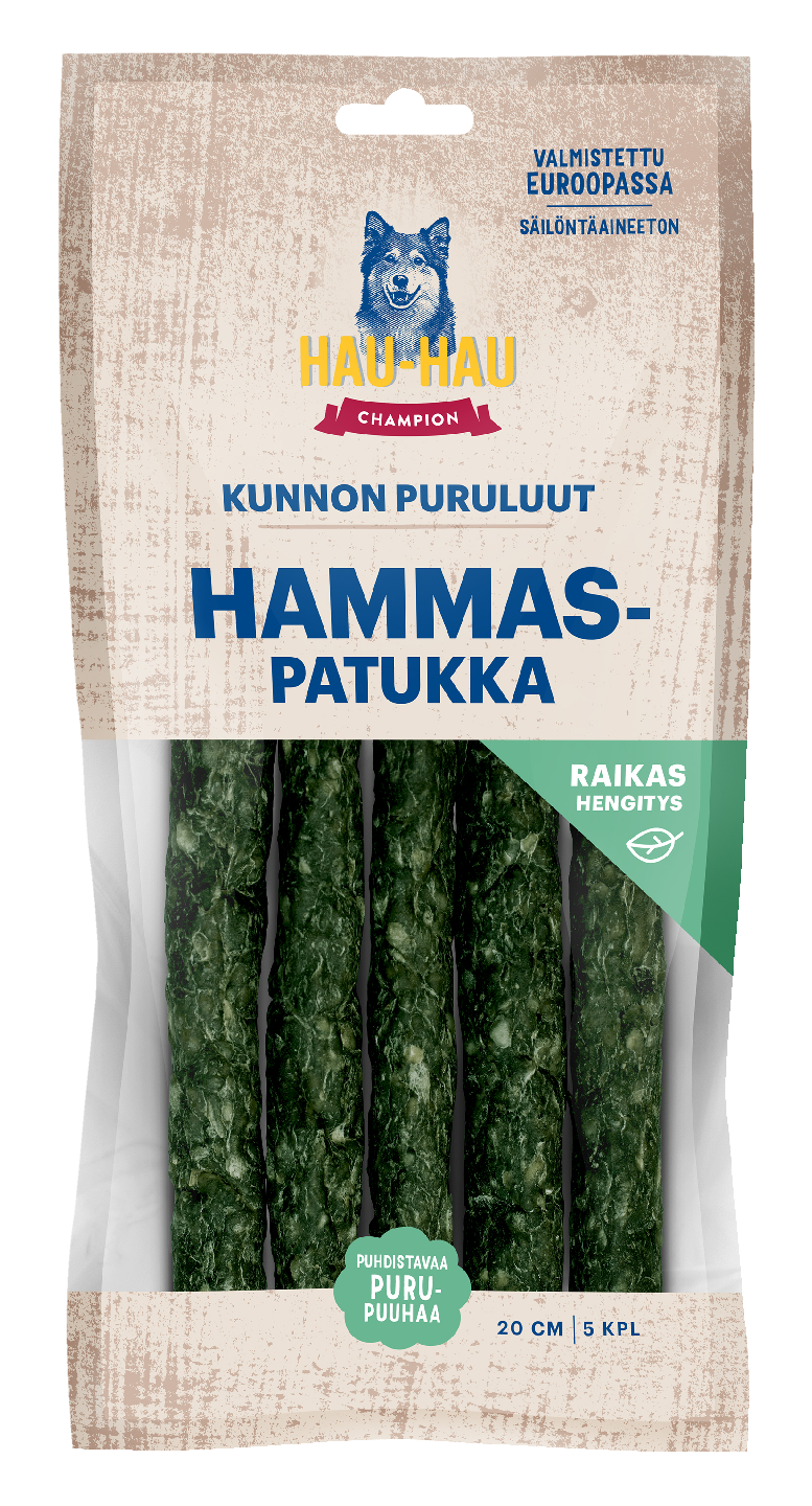 - Puhdistavaa purupuuhaa - Rouhepatukka yrteillä - Raikas hengitys - Säilöntäaineeton - Valmistettu Euroopassa Kunnon puruluut -sarjan Hammaspatukka on herkullinen rouhepatukka, joka on suunniteltu koiran hampaiden hoitoon ja sopii myös pienemmälle puruvoimalle. Pureskelu on koiralle luontaisesti mieluisaa ja hampaita puhdistavaa puuhaa. Puruluuhun lisätyt yrtit raikastavat koiran hengityksen herkutteluhetken lomassa. Hammaspatukassa on runsaasti proteiinia ja vähän rasvaa, eikä lainkaan viljaa tai säilöntäaineita. Maistuvat ja houkuttelevan tuoksuvat Kunnon puruluut valmistetaan omalla tehtaallamme Euroopassa, ja niillä on 100 % tyytyväisyystakuu.