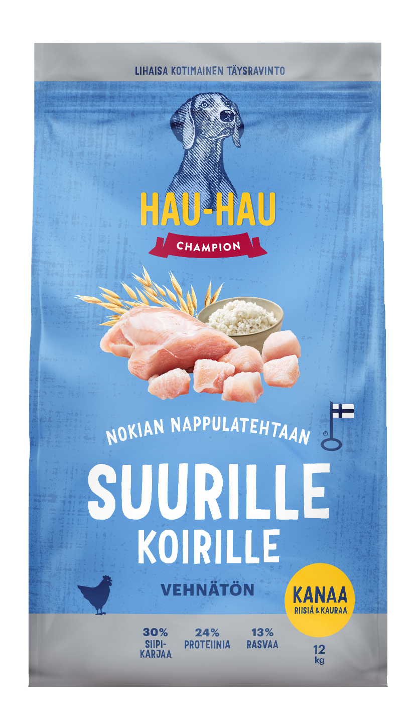 - Iso nappulakoko - Sisältää nivelravinteita - Valmistettu Suomessa Nokialla - 100 % kotimaista kanaa ja kauraa - Ei vehnää, maissia tai soijaa Hau-Hau Champion Kanaa, riisiä & kauraa suurille koirille on lihaisa koiran kuivaruoka, johon lisätyt nivelravinteet hoivaavat suuren koiran niveliä ja tukevat nivelten liikkuvuutta. Iso nappulakoko varmistaa hyvän purutuntuman suurille leuoille. Tämä kotimainen koiranruoka sisältää 30 % kanaa ja kaikkiaan 24 % proteiinia, josta 75 % on eläinperäistä. Kotimainen kana on tämän koiranruoan ainoa eläinproteiinin ja -rasvan lähde. Tuotteen kotimaisuusaste on jopa 79 %. Lempeä, kotimainen kaura ja huolellisesti kypsennetty riisi hellivät koirasi vatsaa. Ripaus kuorittua keltaista hernettä pitää herkullisen nappulan muodossaan. Kotimaisen camelinaöljyn sisältämät omega-3- ja omega-6-rasvahapot ravitsevat koiran turkkia, ihoa ja niveliä. FOS- ja MOS-prebiootit auttavat edistämään koiran suoliston toimintaa ja tukevat vastustuskykyä. Tämä kuivaruoka on valmistettu Nokian Nappulatehtaalla Pirkanmaalla. HUOM! Olemme päivittäneet Hau-Haun kuivaruokapusseja vuoden 2025 aikana. Tarkista tuotteen ainesosat myös myyntipakkauksesta.