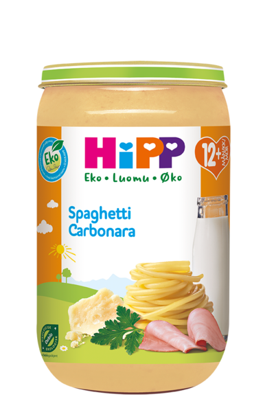 HiPPin ilmastopositiiviset ateriat on valmistettu huolella parhaista luonnonmukaisista raaka-aineista. Siksi ne ovat mieluisia ja maistuvat hyviltä. Kaikki reseptimme on laadittu ravitsemusasiantuntijoiden kanssa, jotta voit olla varma, että lapsesi saa ruoasta kaikki tarvitsemansa hyödyt. HiPP Luomu Spaghetti Carbonara. Vain parhaista luomuraaka-aineista huolella valmistettu lämminruoka. Alkaen 12 kuukauden ikäisille. Sopii lounaaksi tai illalliseksi.