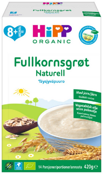 HiPP ilmastoneutraalit puurot ovat mieluisia ja ravinteikkaita aterioita, jotka sopivat maittavaksi aamiaiseksi, välipalaksi tai iltapalaksi. Kaikki puurot sisältävät omega-3-rasvahappoja, ja ne on valmistettu huolella valituista luonnonmukaisista raaka-aineista. HiPPiS Luomu Täysjyväpuuroa Naturell, alkaen 8 kk. Soveltuu mainiosti niin aamu-väli -kuin iltapalaksi.