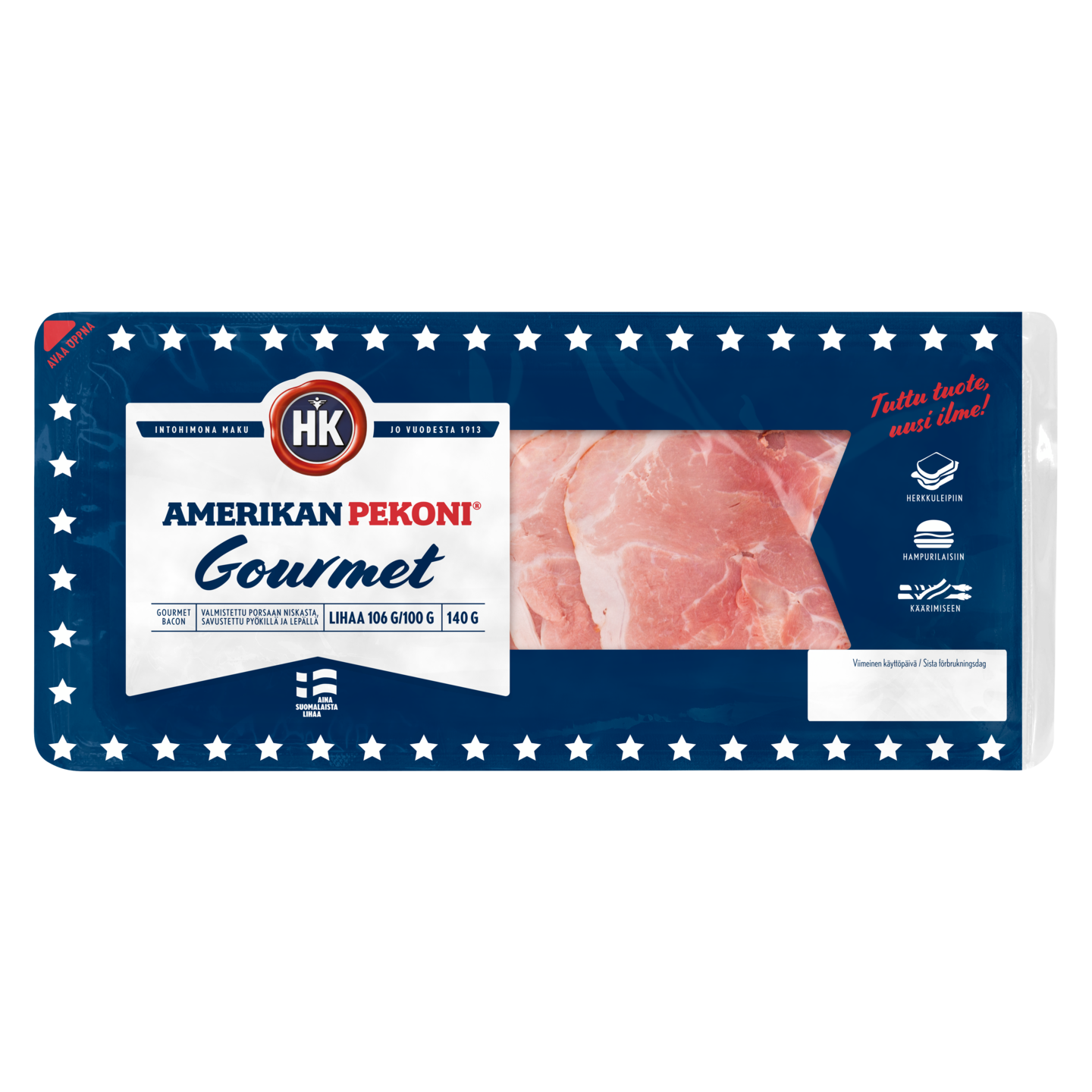 HK Gourmet pekonin hienostunut maku syntyy kuivasuolaamalla ja savustamalla aidolla hakesavulla. Laadukkaasta porsaanniskasta valmistettu pekoni sopii sellaisenaan paistettavaksi tai ruuanlaittoon. Erityisen hyvin pekoni sopii hampurilaisten väliin pyöreän muotonsa ansiosta. Myös lämmin klassikkoleipä B.L.T. nousee tällä pekonilla Gourmet-tasolle. Lajittele pakkaus käytön jälkeen muovina.